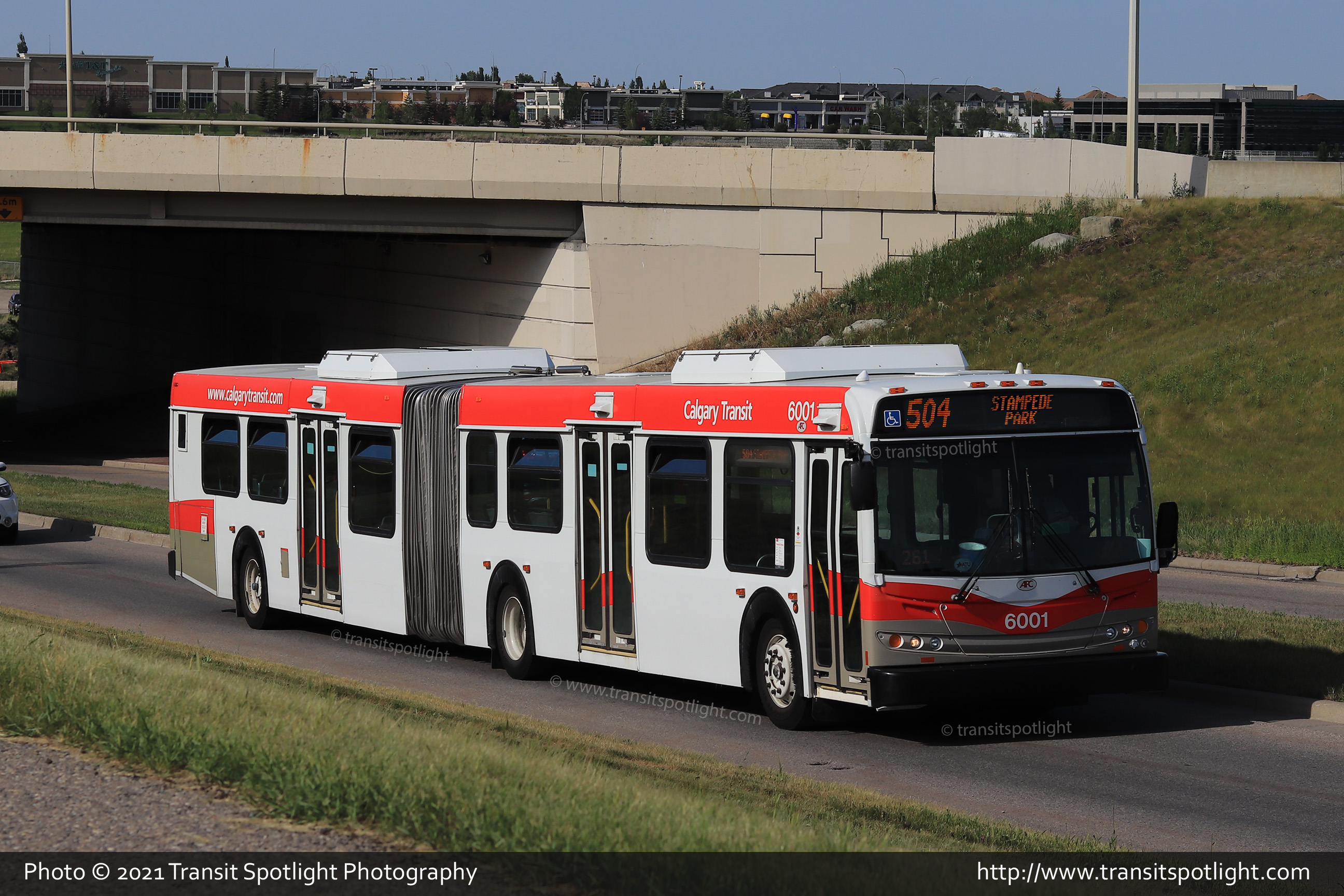 6001 is seen on Harvest Hills Blvd approaching Centre St N while working Route 504 Stampede North Express (southbound). |