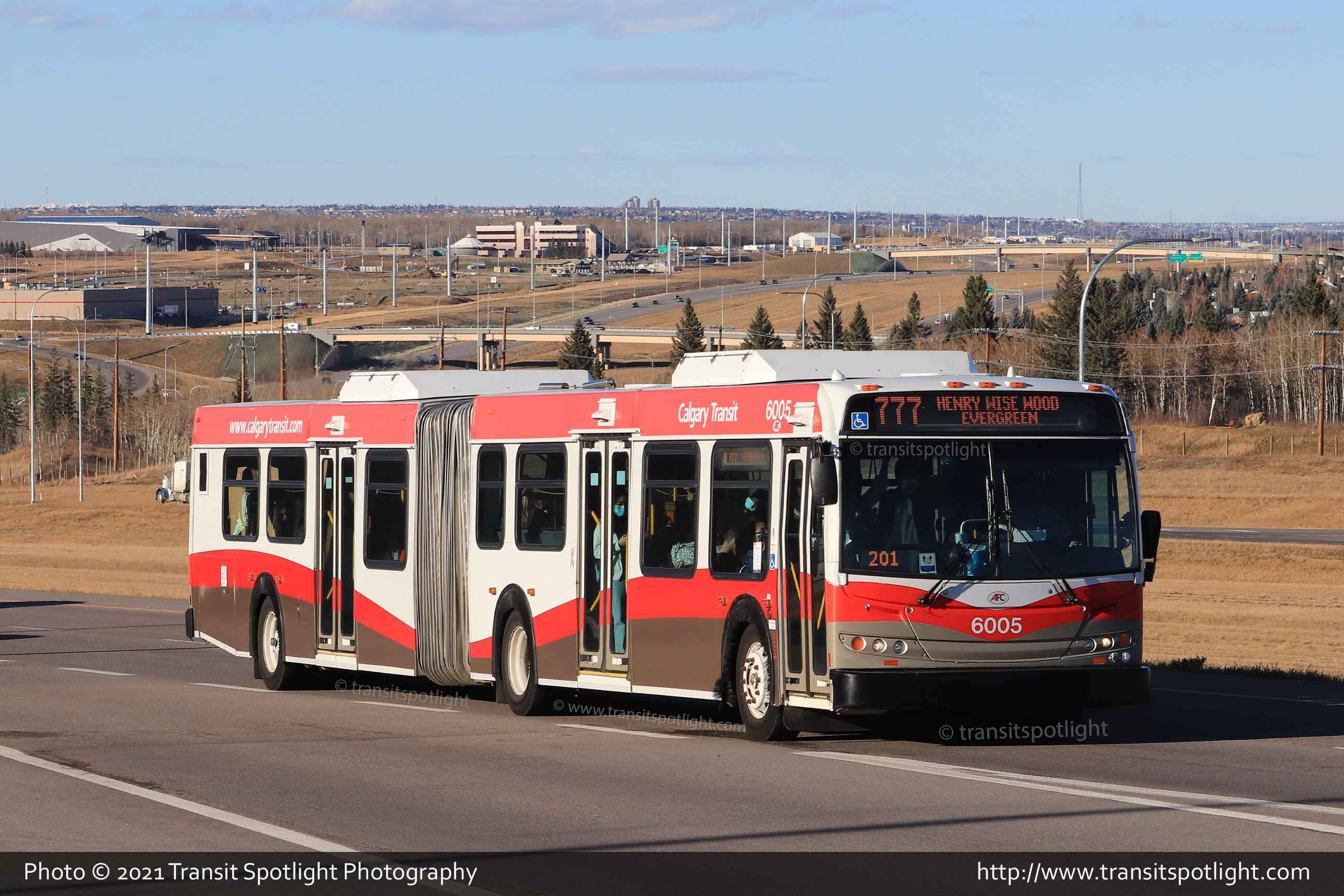 6005 is seen exiting off Tsuu T'ina Trail SW at Fish Creek Blvd SW while working Route 777 Henry Wise Wood / Evergreen. |