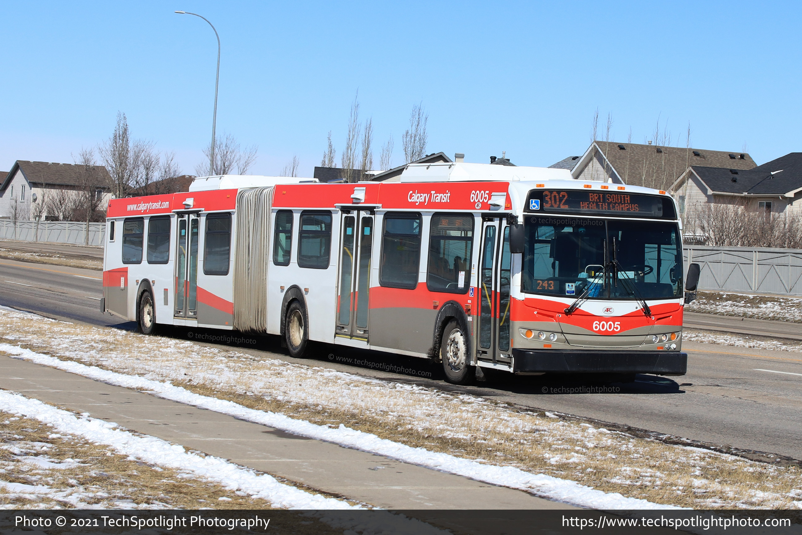 6005 is seen at 52 Street and North of McKenzie Towne Blvd SE while working Route 302 BRT Southeast. |
