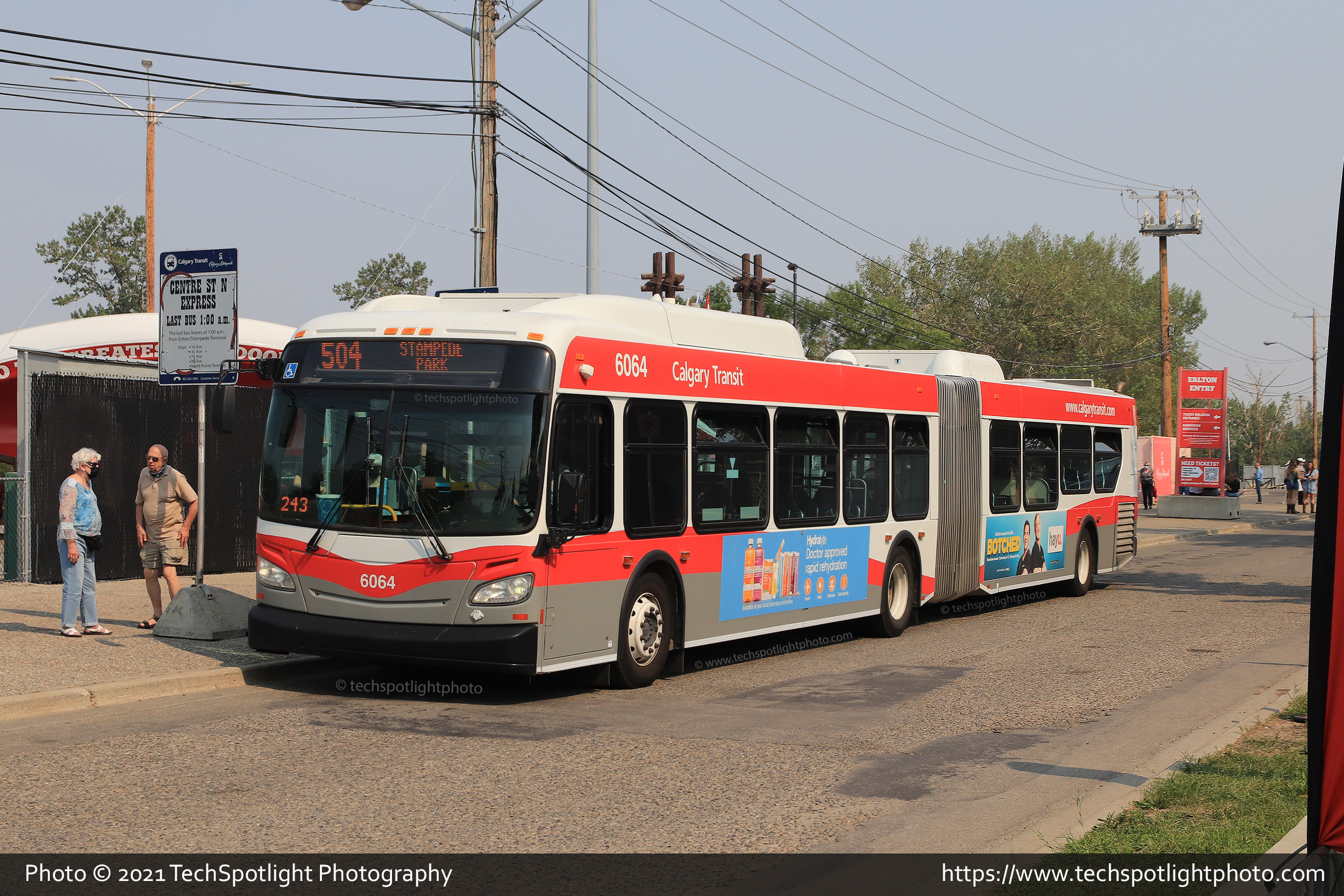 6064 is seen resting at Stampede Park (Erlton entry) while working Route 504 Stampede North Express. |