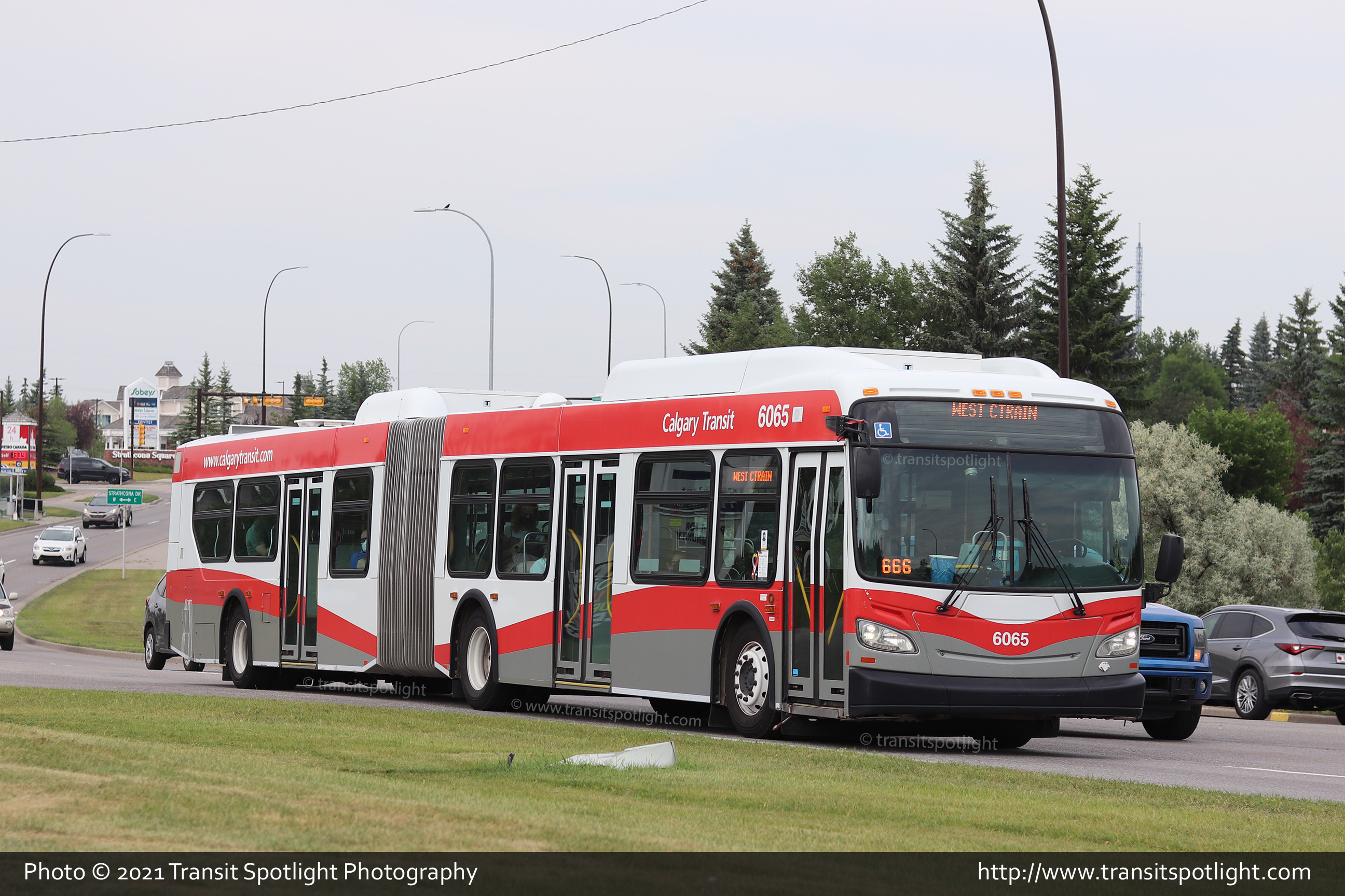 6065 is seen at Strathcona Blvd and 14 Avenue SW while working an unplanned Blue Line CTrain disruption shuttle in between 69 St and 45 St Stations, due to a Calgary Police matter at Sirocco Station. |