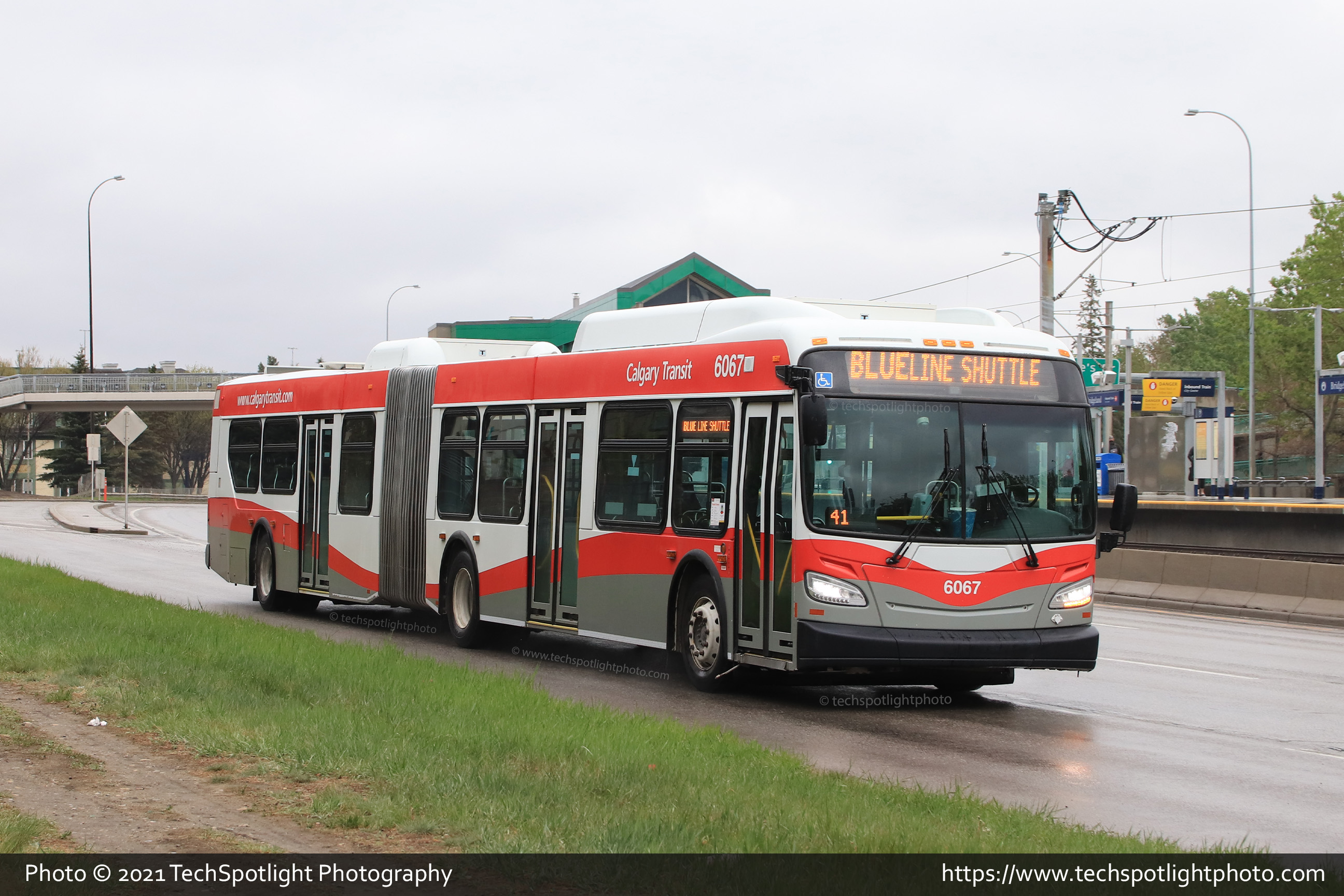 6067 is seen on Memorial Drive NE outside of the Bridgeland LRT Station while working a Blue Line CTrain disruption shuttle towards Downtown West / Kerby Station. |
