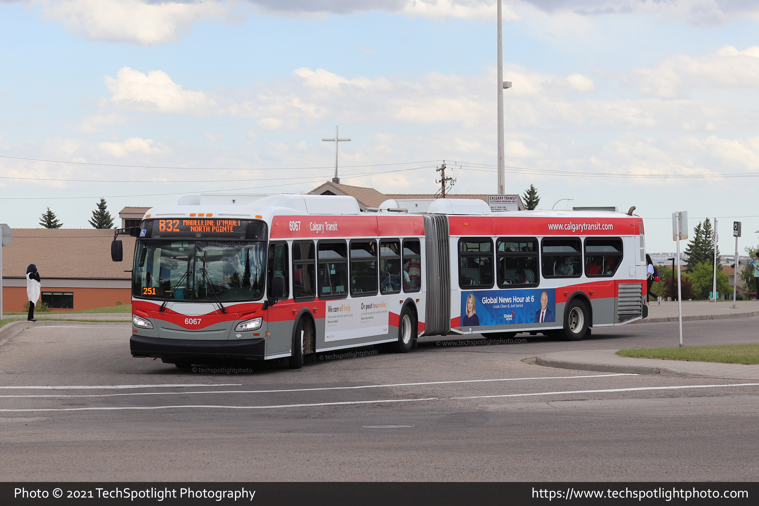6067 is seen departing the Sandstone Terminal in NW Calgary while working Route 832 Madeleine D'Houet / North Pointe. As of September 2021, this route no longer serves Sandstone, it instead is served by the modified Route 89. |