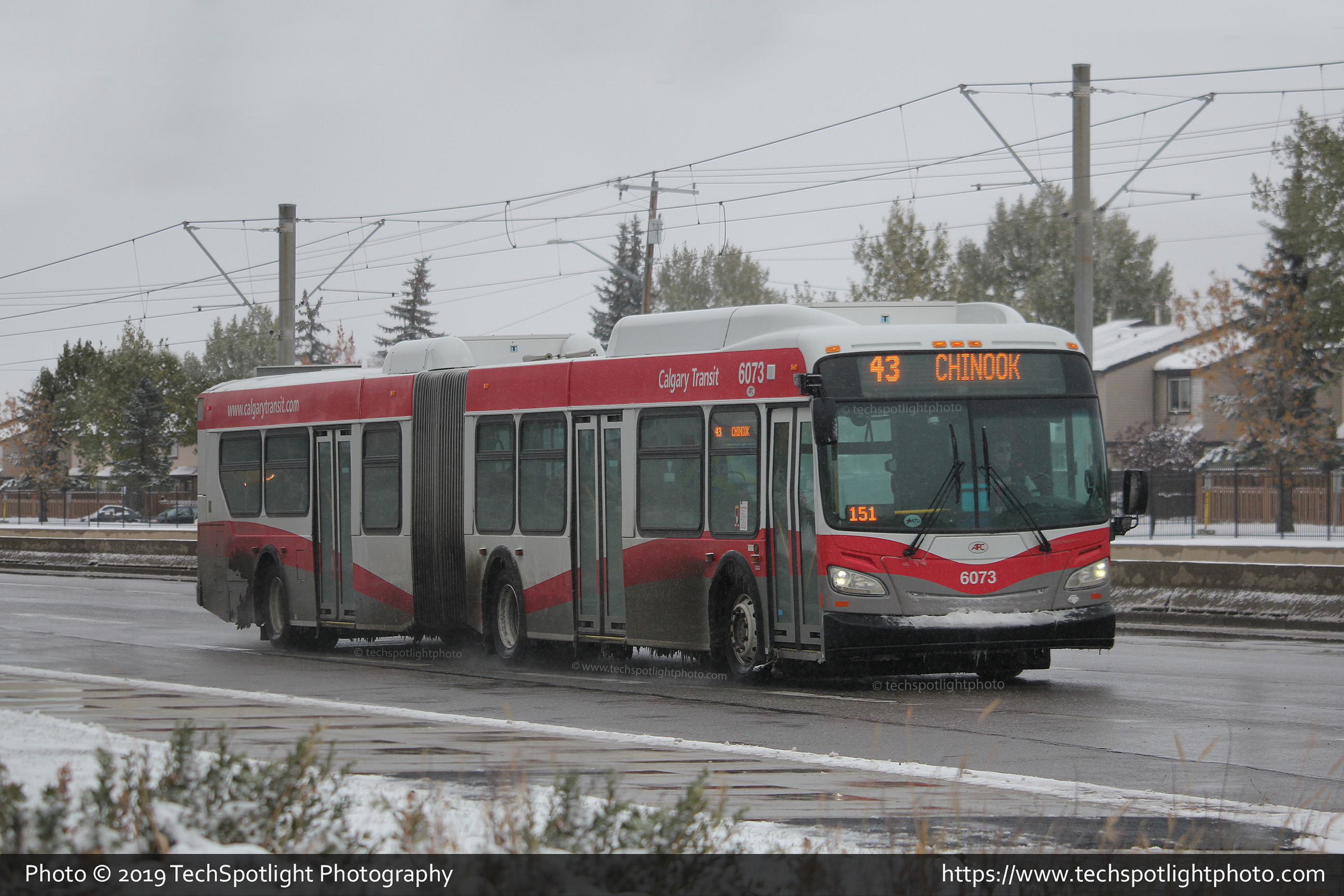 6073 is seen at 36 Street and 26 Avenue NE, adjacent to the NE LRT tracks while working a 40-foot piece of work on Route 43 towards Chinook Station. |