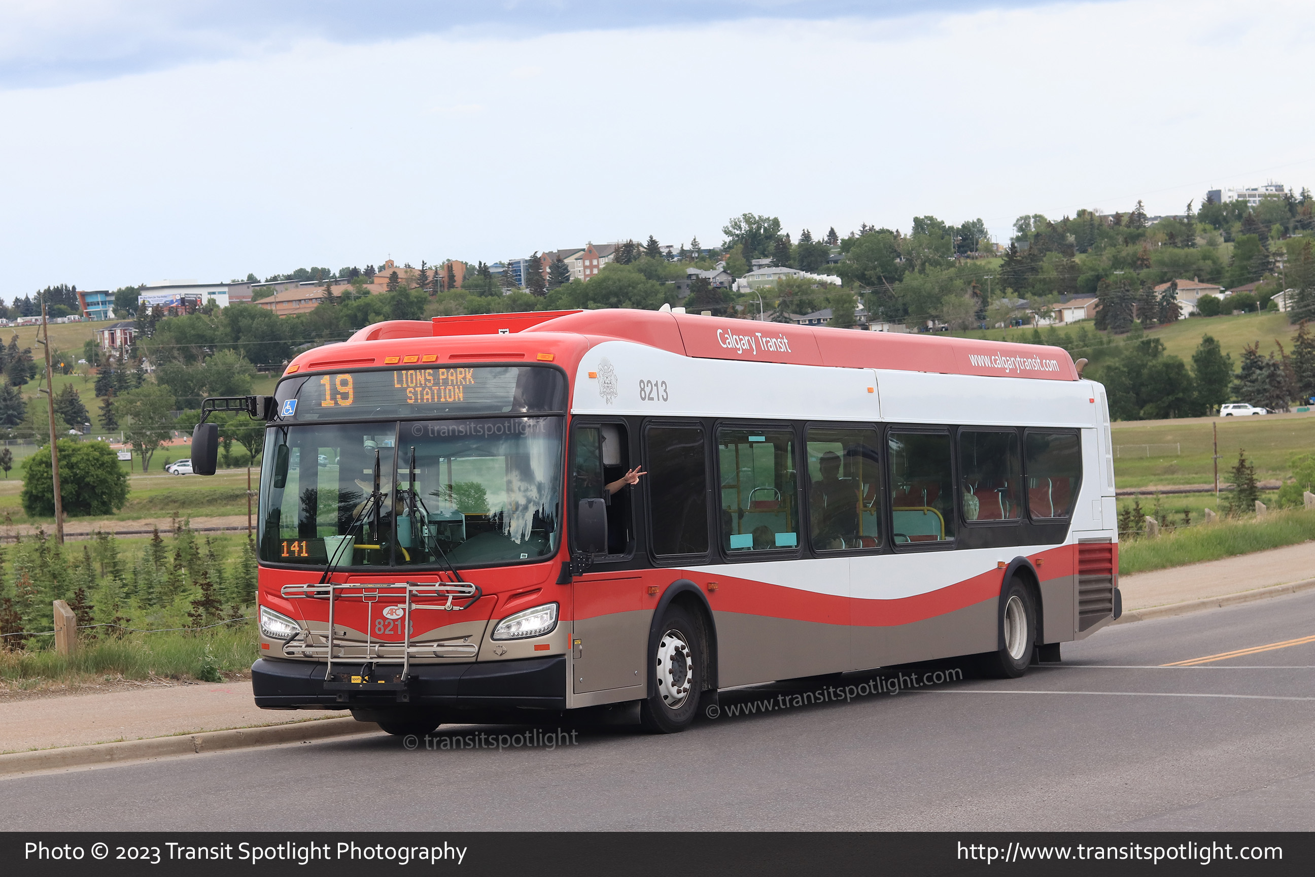 8213 is seen on the 8 Avenue NE bridge overtop of Deerfoot Trail NE while working Route 19 - 16 Avenue North to Lions Park Station. |