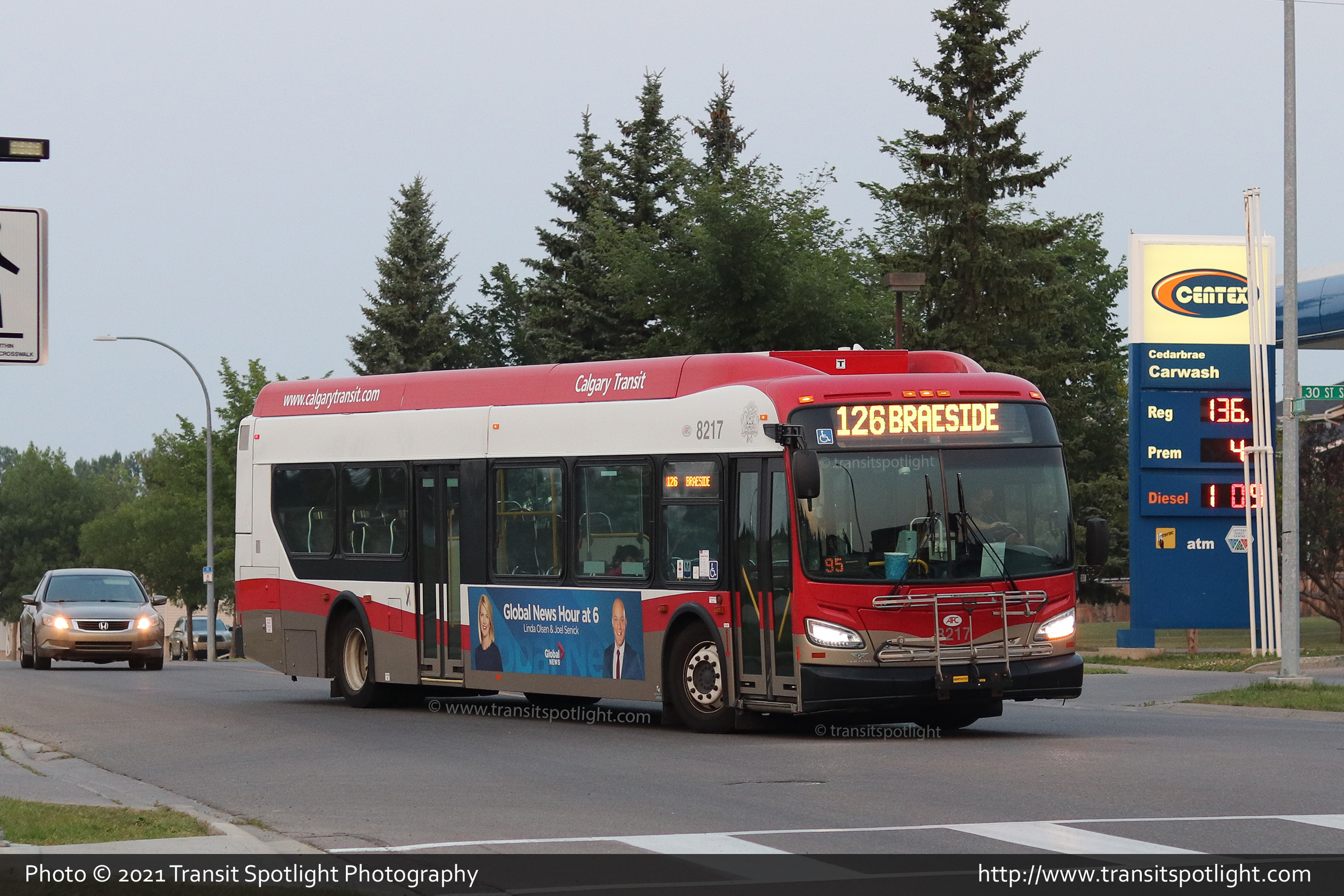 8217 is seen at Oakfield Drive and 30 Street SW while working a community shuttle key on Route 126 Braeside. |