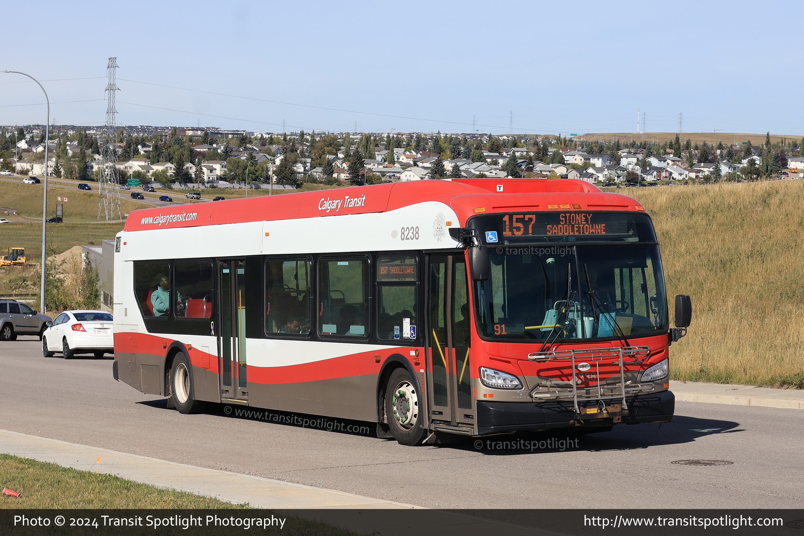 8238 is seen on 110 Avenue at 14 Street NE while working Route 157 Stoney Industrial to Saddletowne LRT Station. |