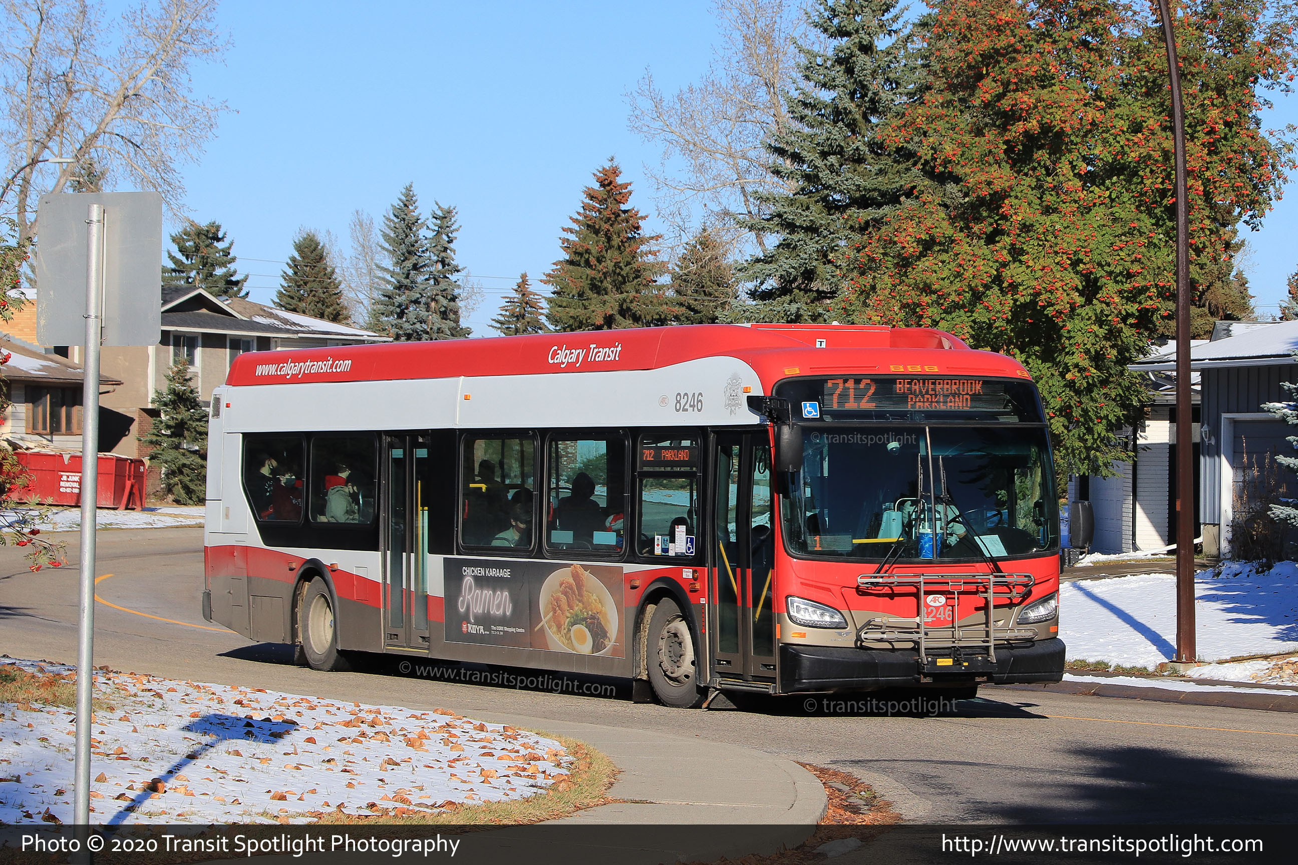 8246 is seen at Lake Bonavista Drive and Lake Aspen Road SE while working Route 712 Lord Beaverbrook HS / Parkland. |