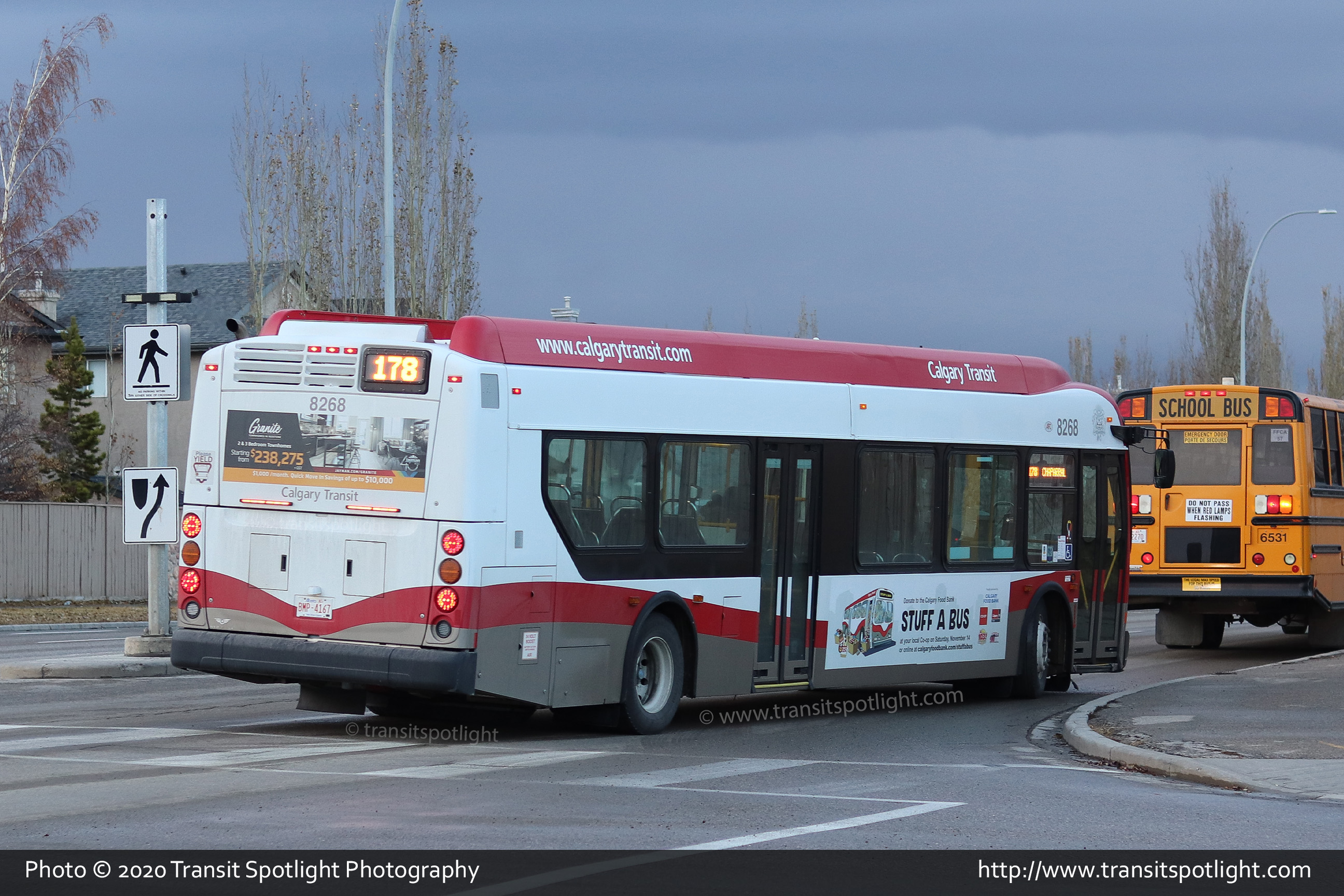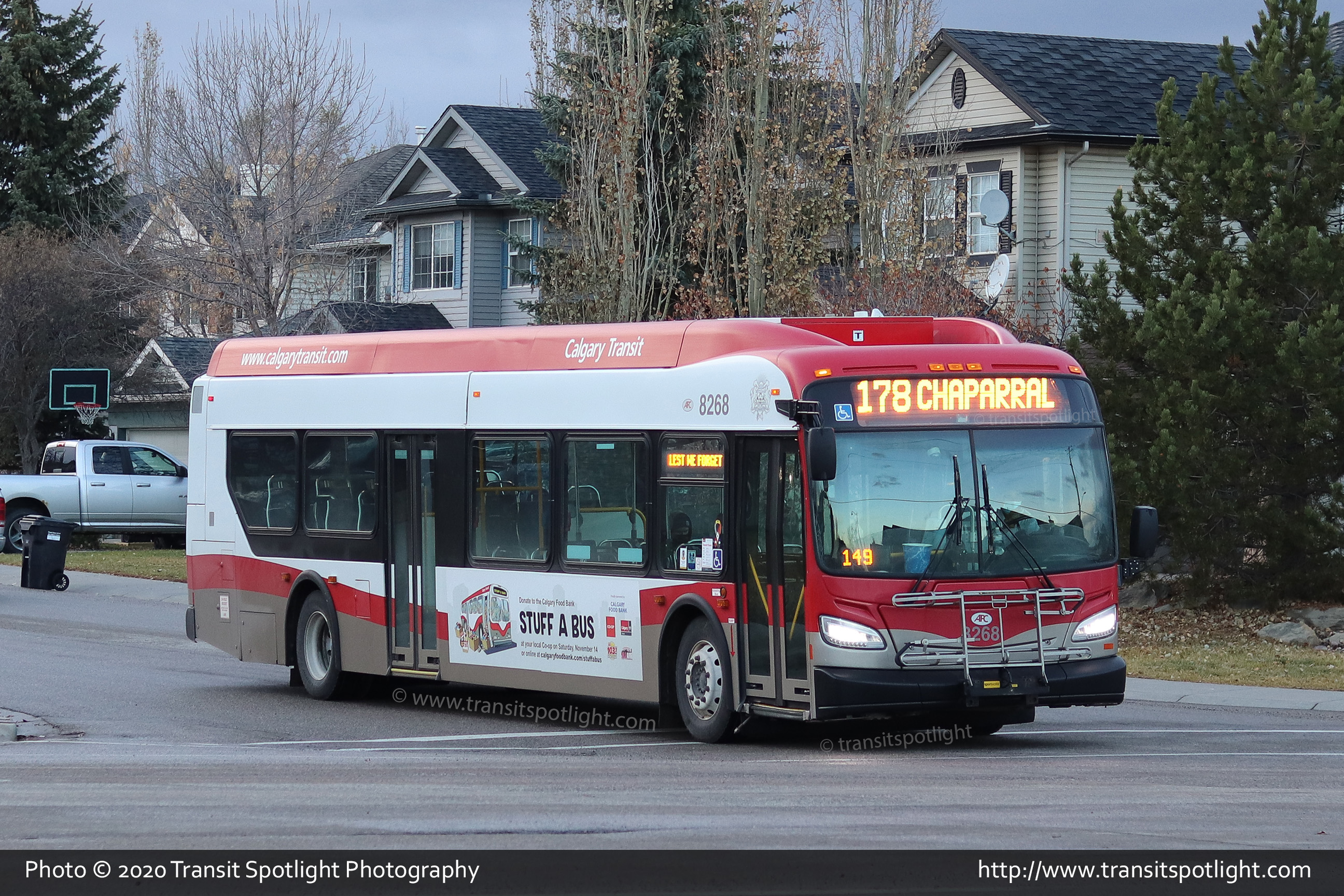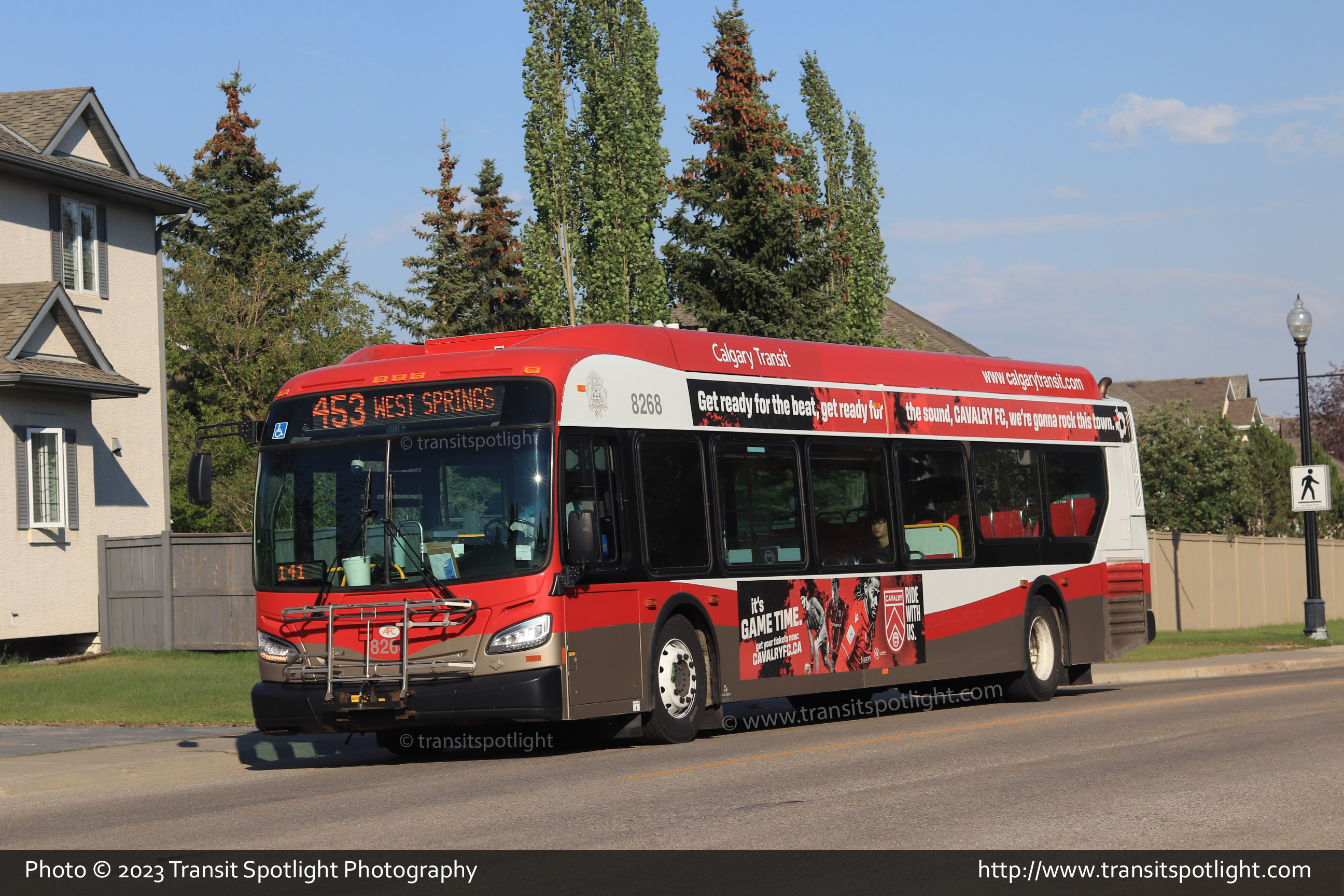 8268 is seen on Strathcona Drive at Strathridge Way SW while working Route 453 West Springs. |