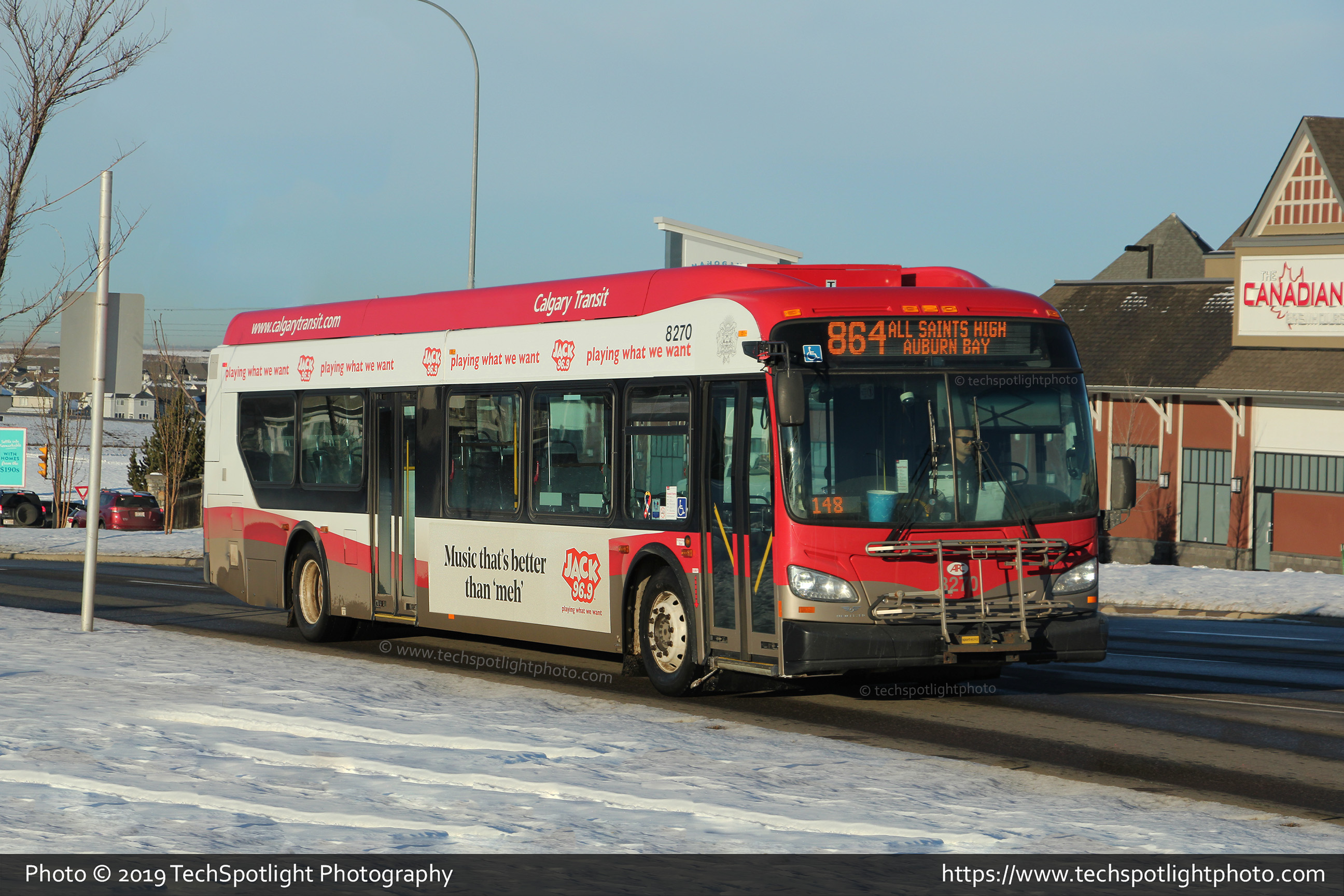 8270 is seen at 52 Street and Auburn Bay Drive SE while working Route 864 All Saints High / Auburn Bay. |