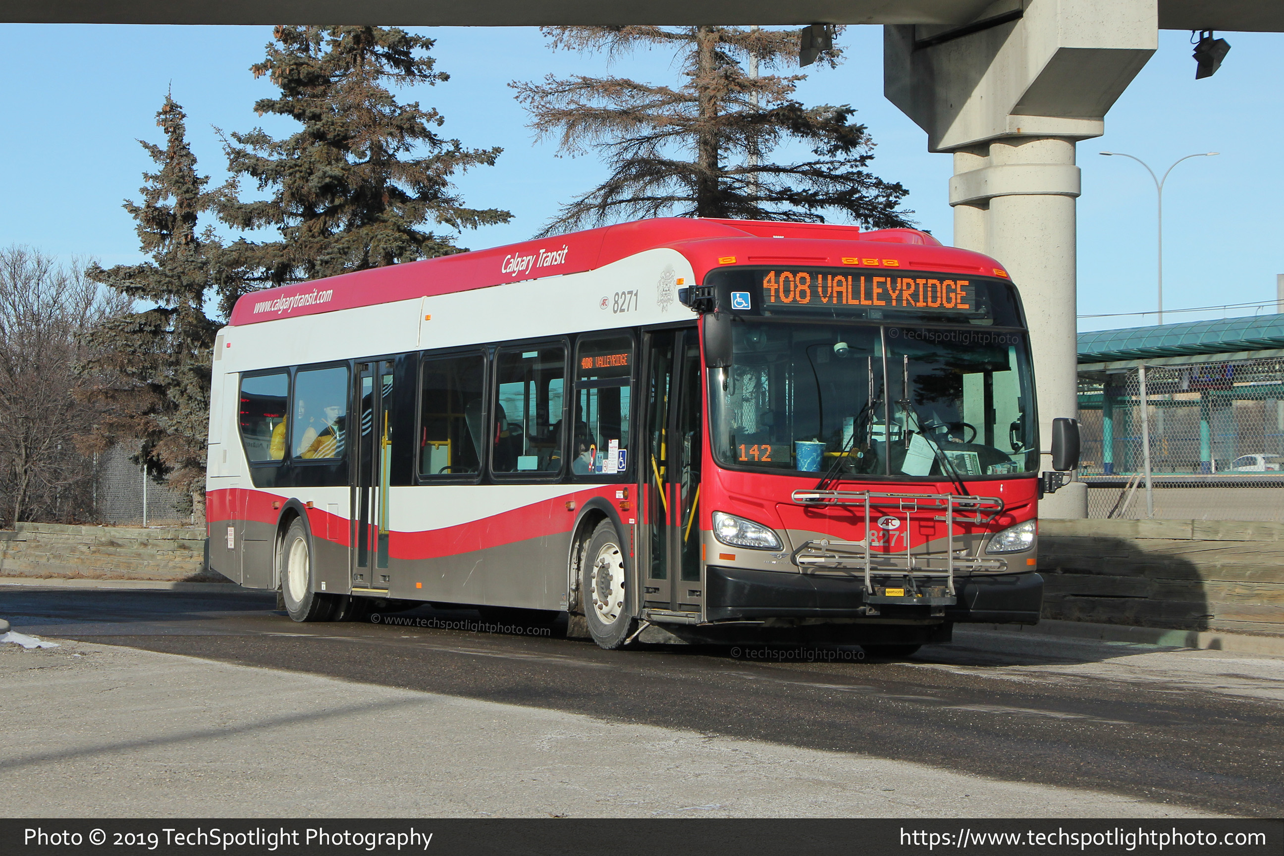 8271 is seen departing Brentwood LRT Station while working Route 408 Valley Ridge. |