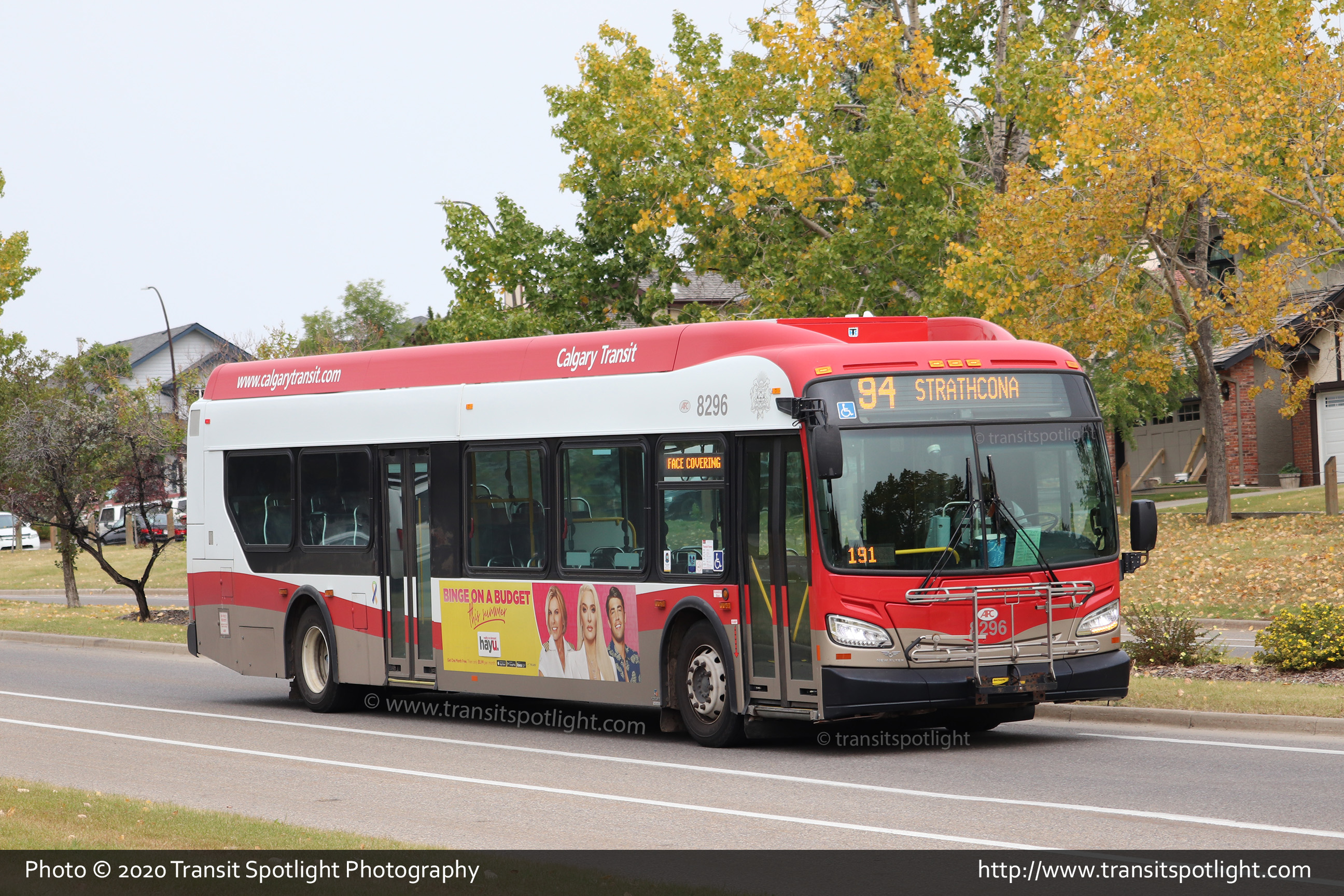 8296 is seen at Strathcona Blvd and Strathdale Close SW while working a community shuttle key on Route 94 Strathcona |