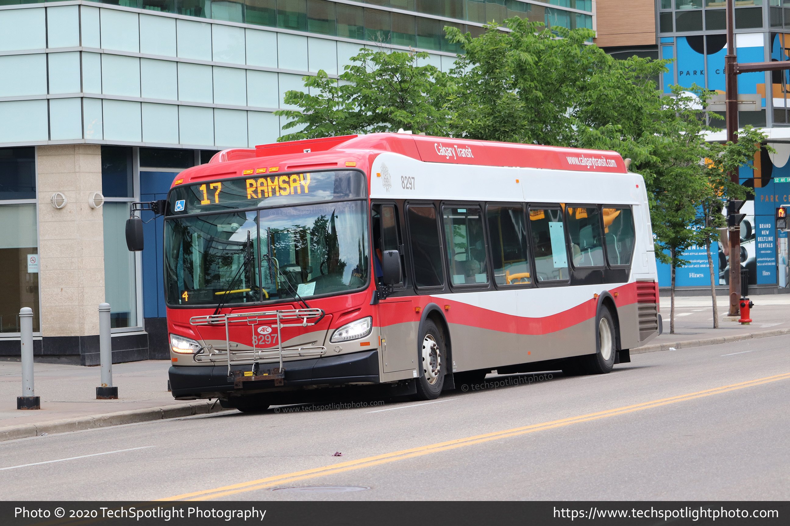 8297 is seen at 4 Street and 13 Avenue SW while working Route 17 Ramsay. |