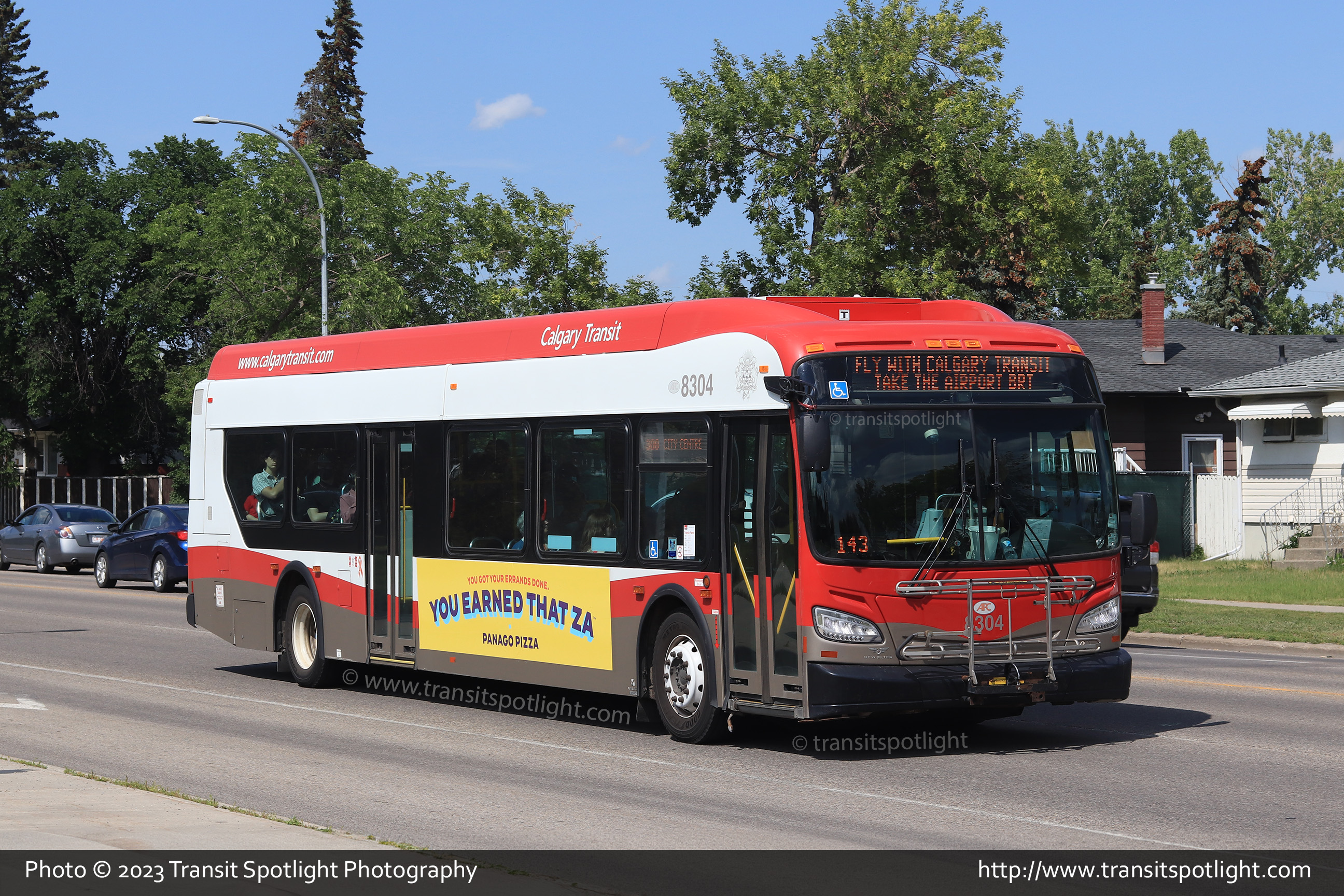 8304 is seen on Centre Street at Centre Cresent displaying the "Fly with Calgary Transit" PR code while working Route 300 BRT Airport to City Centre. |