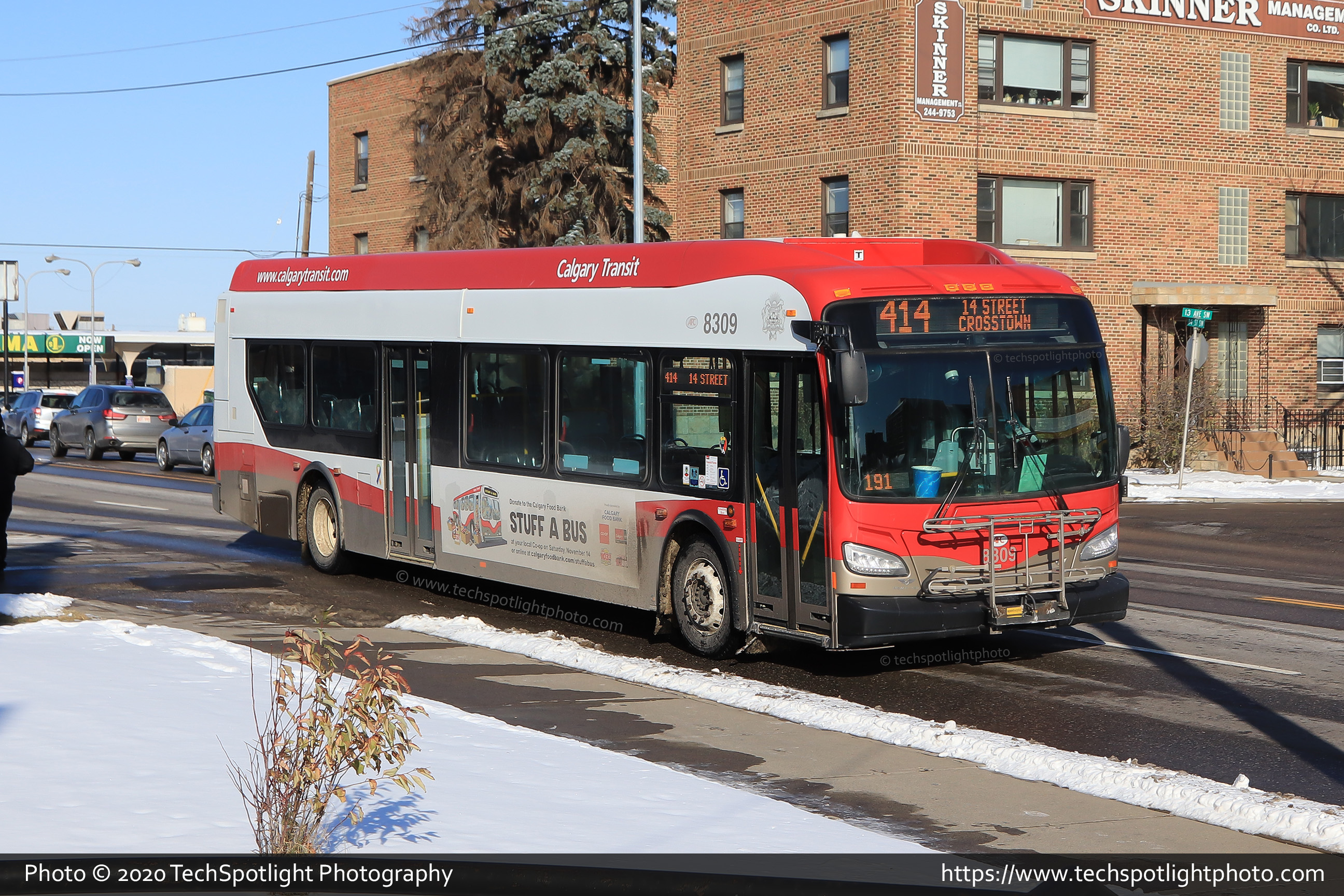 8309 is seen at 14 Street and 13 Avenue SW while working a community shuttle key on Route 414 14 Street Crosstown (southbound) |