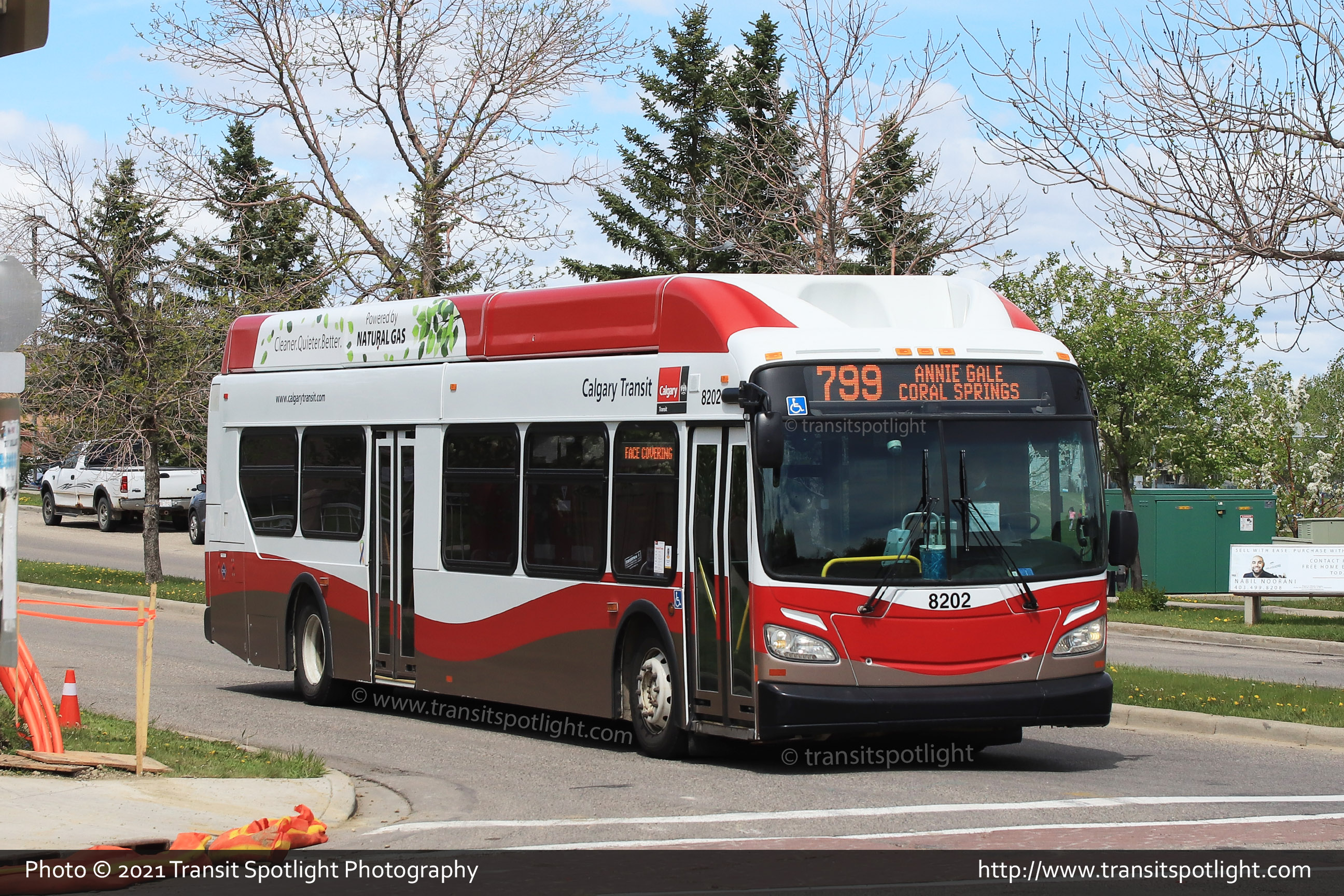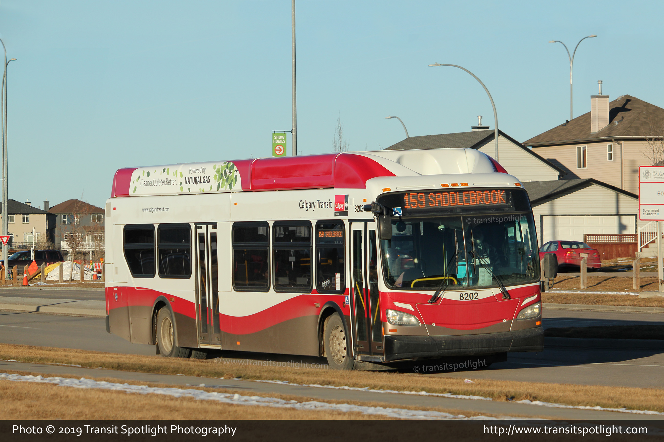 8202 is seen on 60 Street and south of 88 Avenue NE while working Route 159 Saddlebrook. This bus had recently been wrapped in the red livery at the time of the capture of this image. |