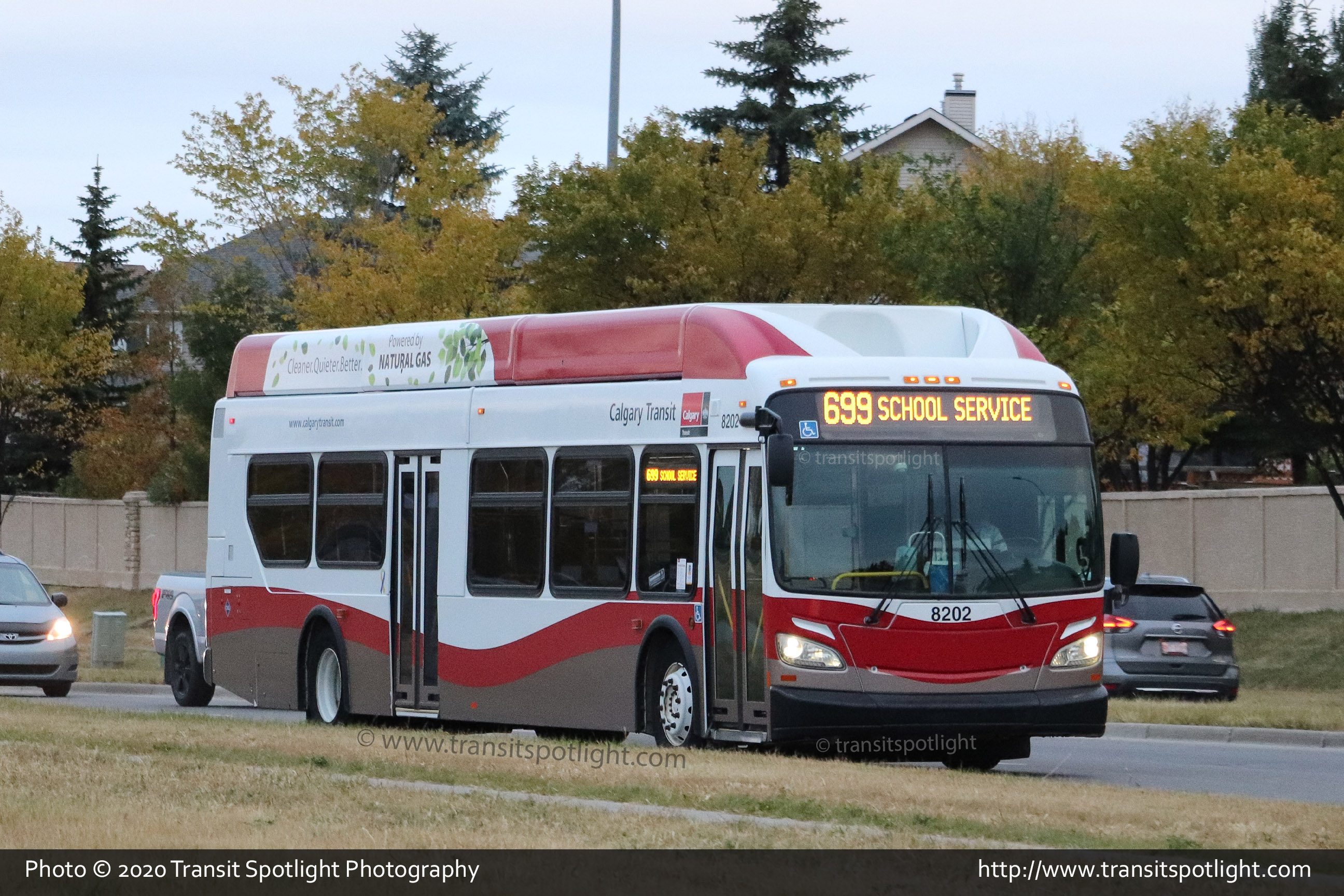 8202 is seen travelling on Old Banff Coach Road SW in between 89 and 85 Streets while working Route 699 School Service. |