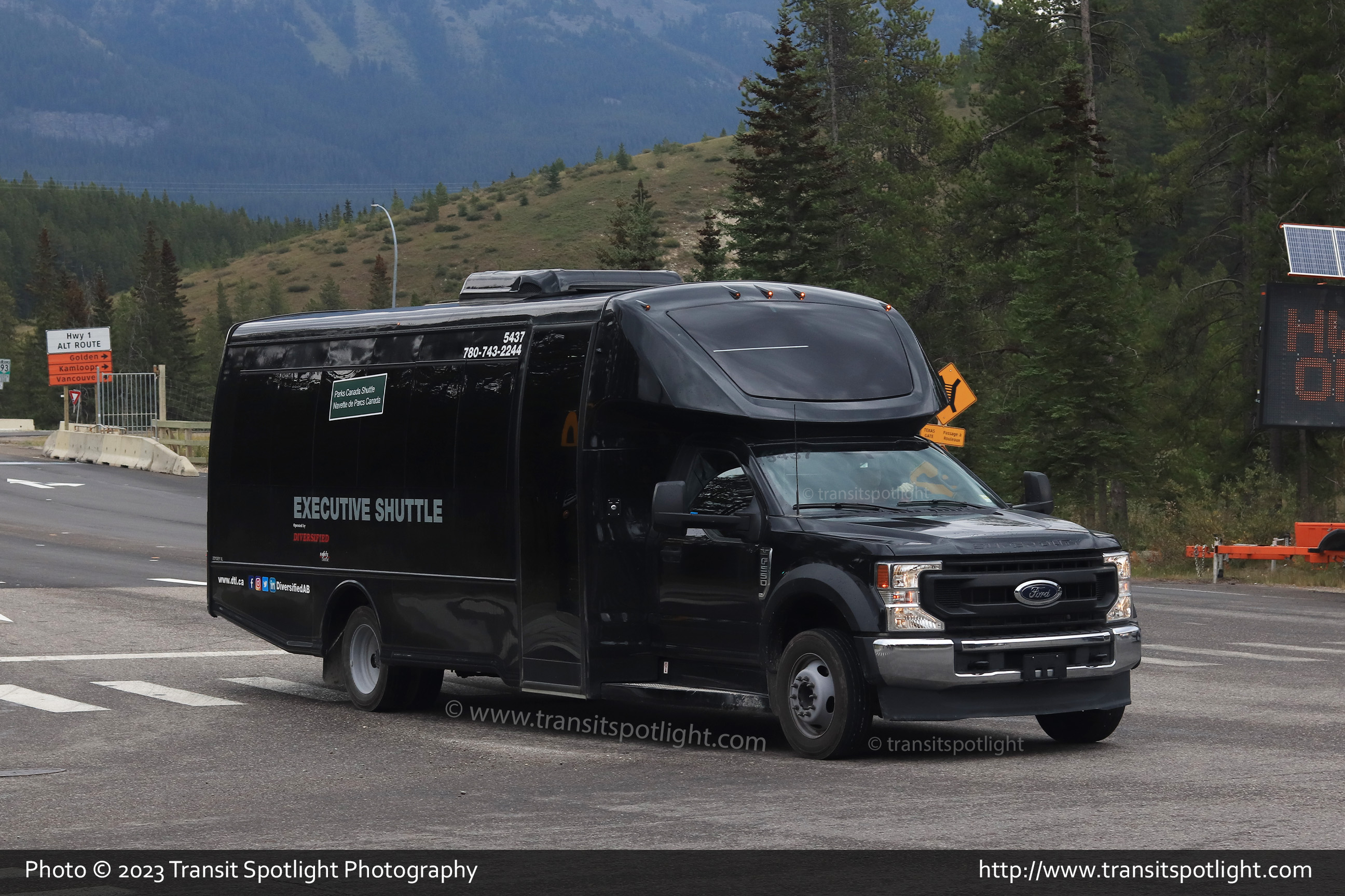 5437, a 2022 Turtle Top Odyssey on a Ford F-550 chassis is seen on Lake Louise Drive at Village Road in Lake Louise, AB while working a Parks Canada shuttle. |