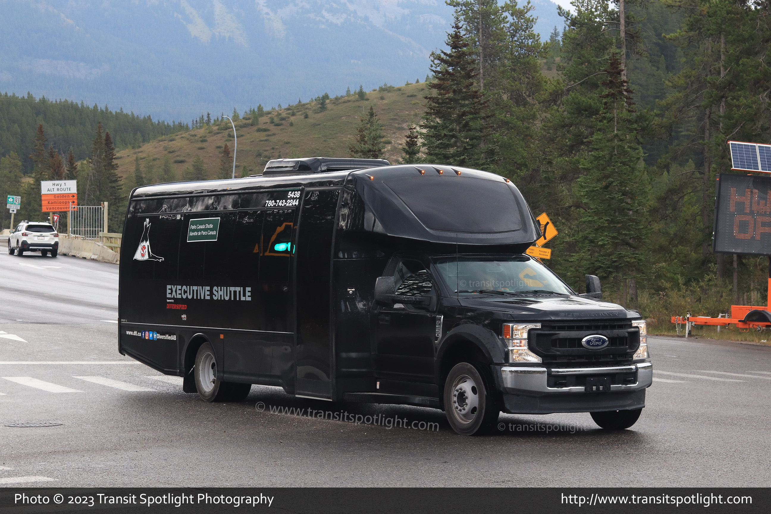 5438, a 2022 Turtle Top Odyssey on a Ford F-550 chassis is seen on Lake Louise Drive at Village Road in Lake Louise, AB while working a Parks Canada shuttle. |