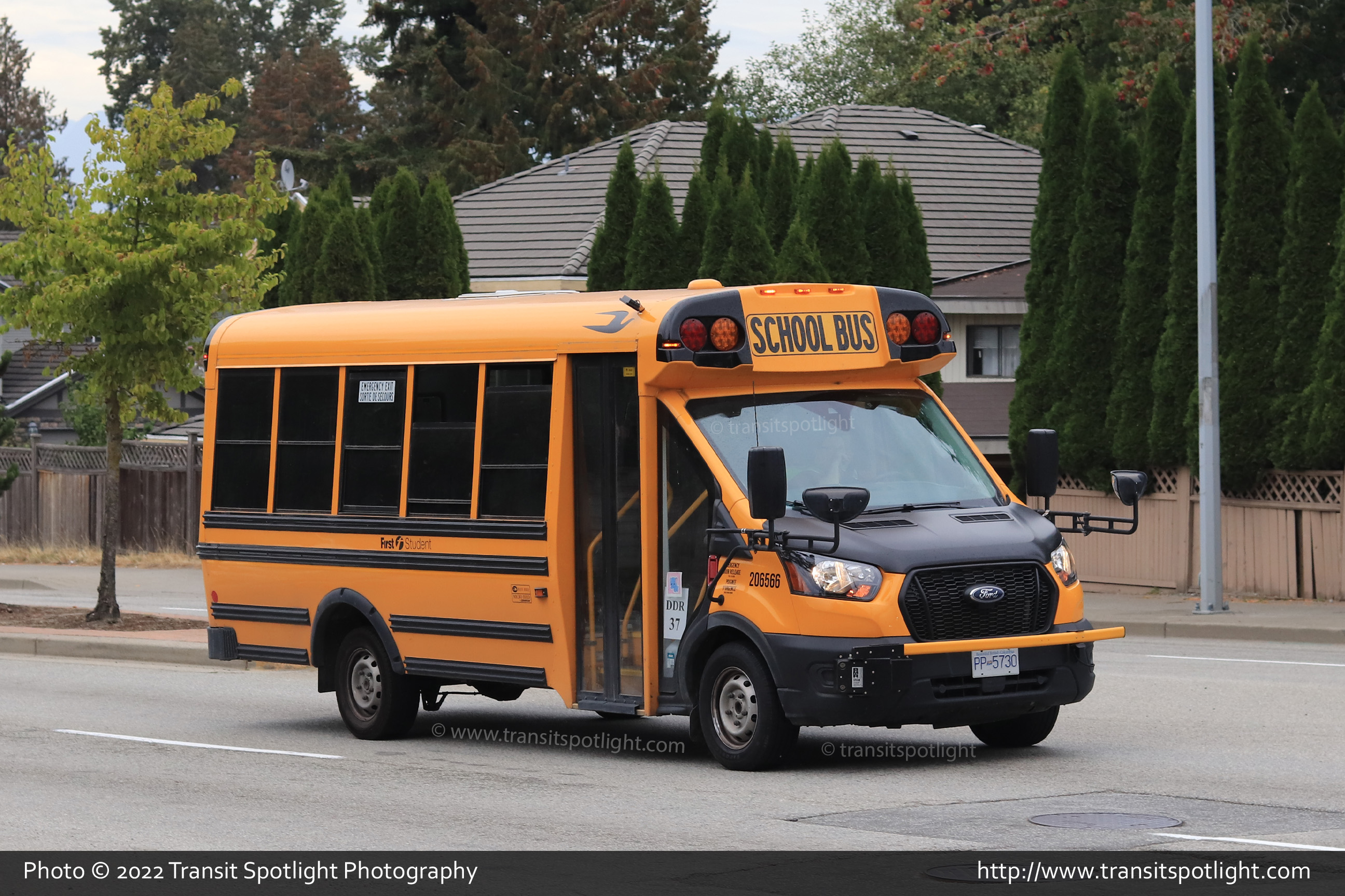 206566, a 2020 Blue Bird MB-II on a Ford Transit chassis is seen on Scott Road at 96 Avenue in Surrey, BC. |