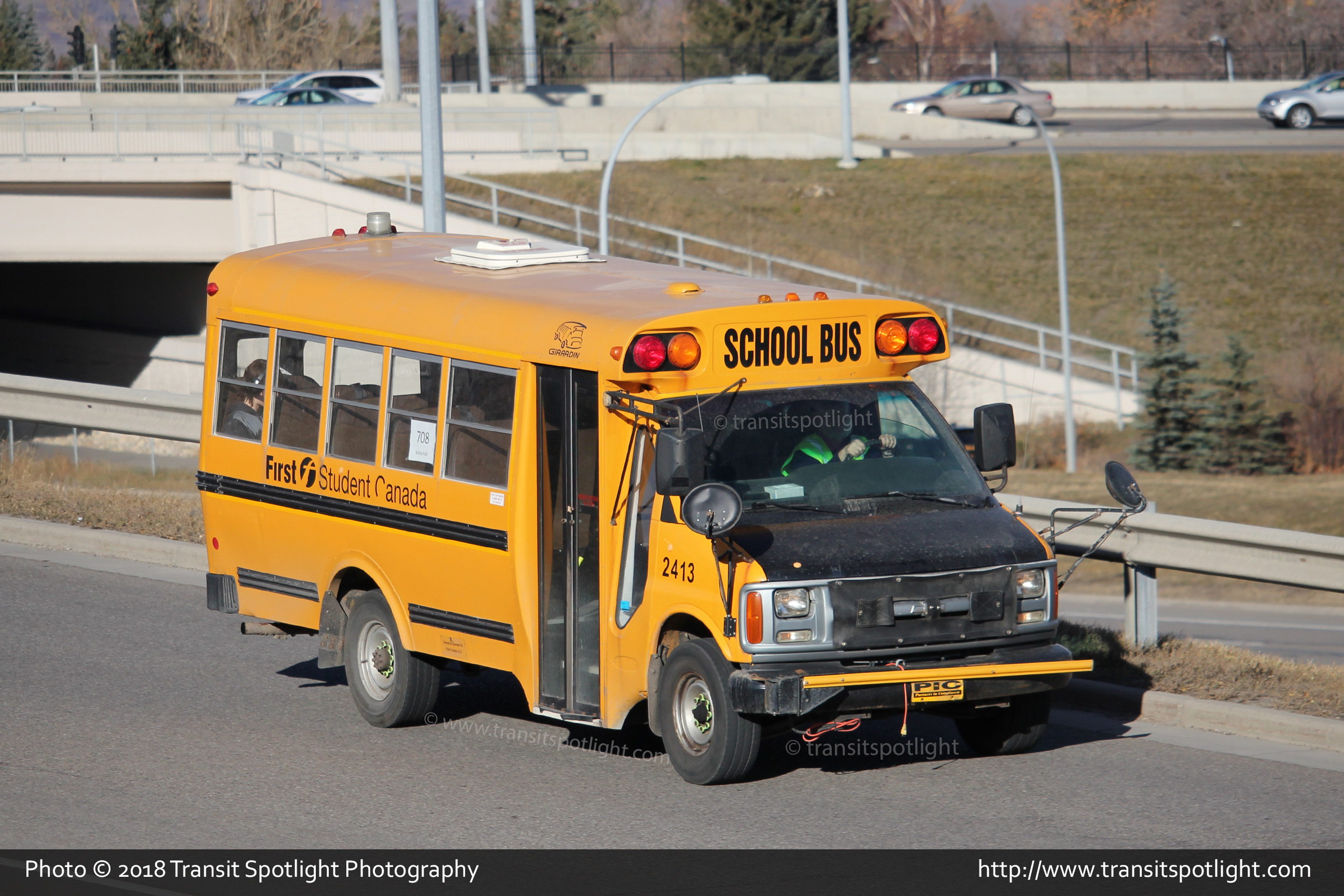 2413, a 2002 Girardin MB-II on a Chevrolet Express chassis is seen on Sarcee Trail at 17 Avenue SW in Calgary, AB. |