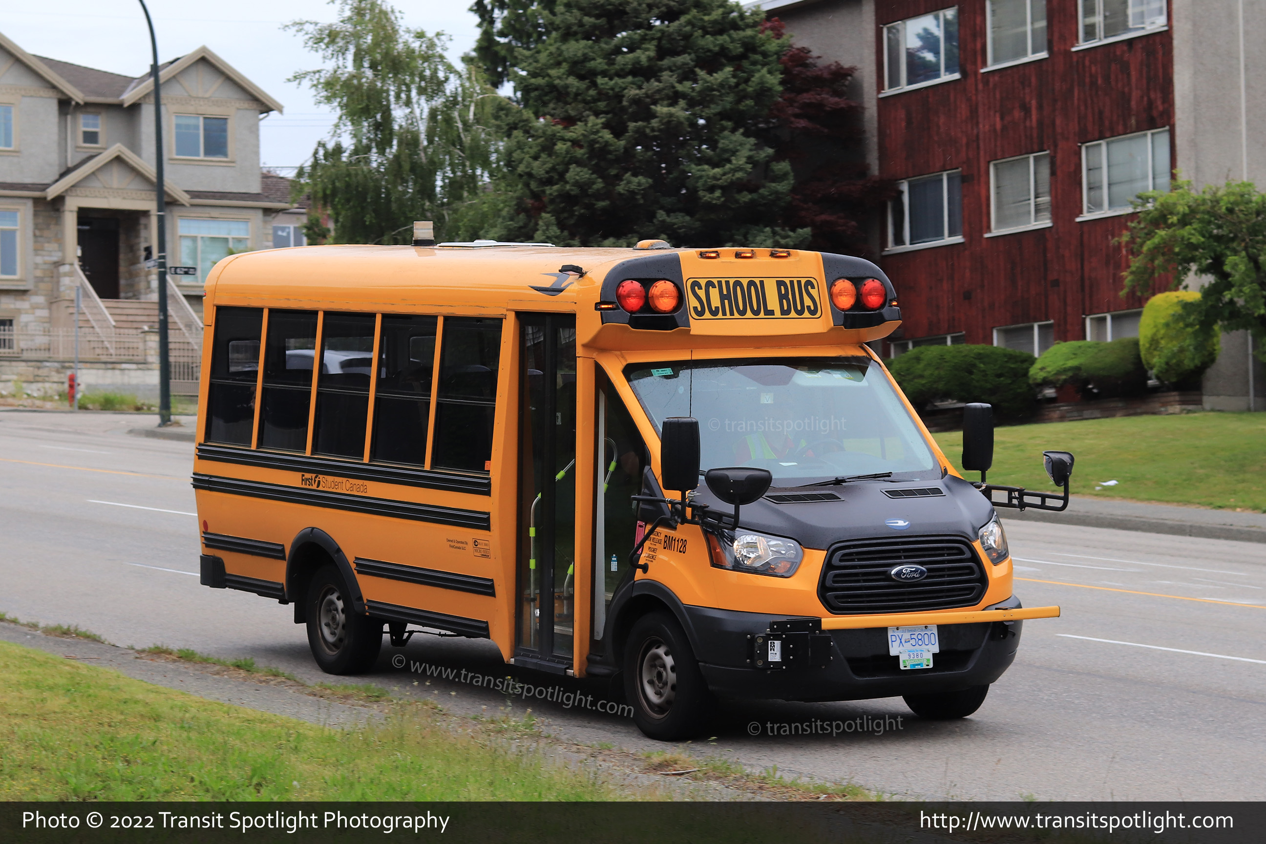 BM1128, a 2018 Blue Bird MB-II on a Ford Transit chassis is seen on Knight Street at 63 Avenue in Vancouver, BC. |