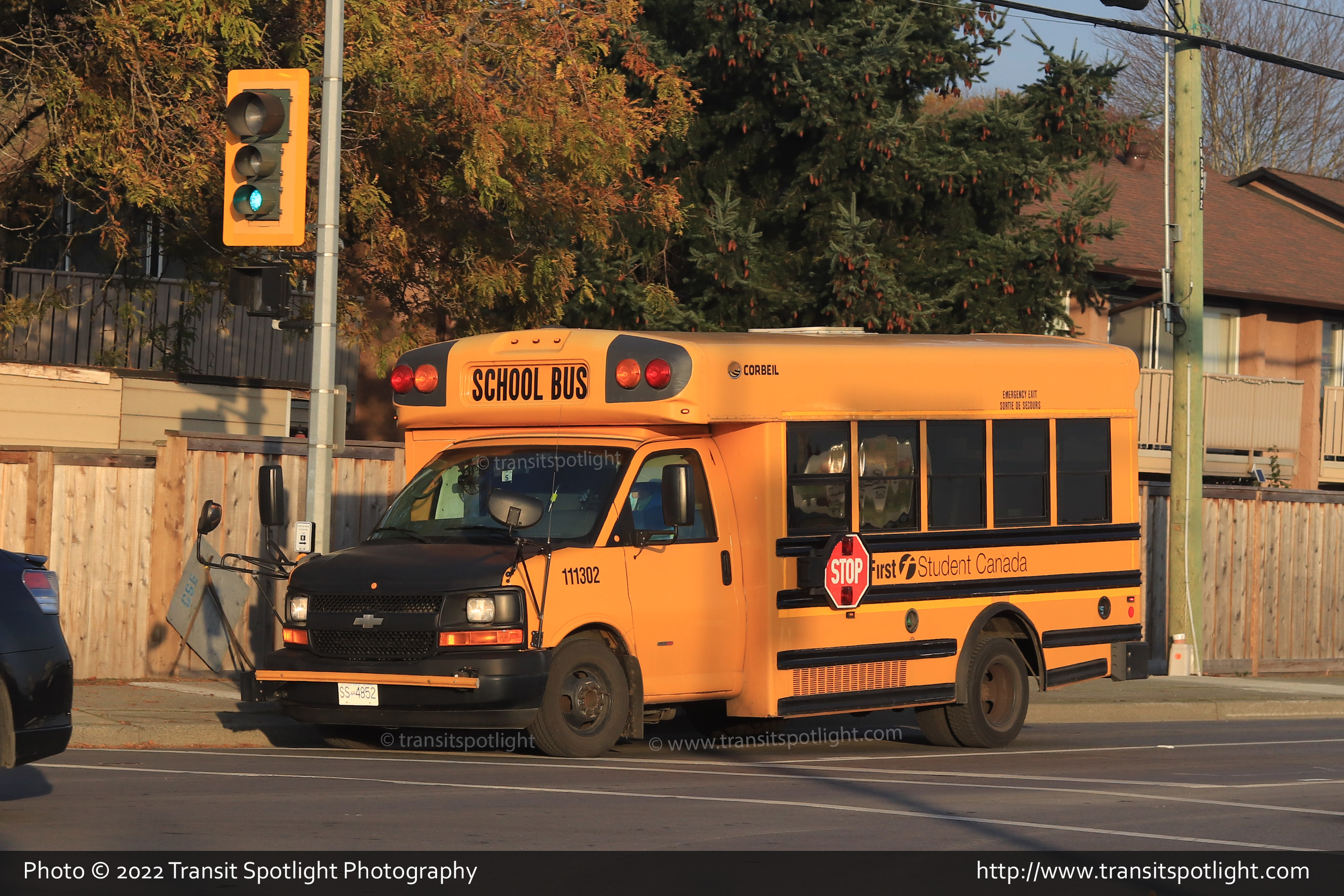 111302, a 2011 Corbeil Quantum on a Chevrolet Express chassis is seen on Steveston Highway at Number 4 Road in Richmond, BC while completing it's assigned route. |