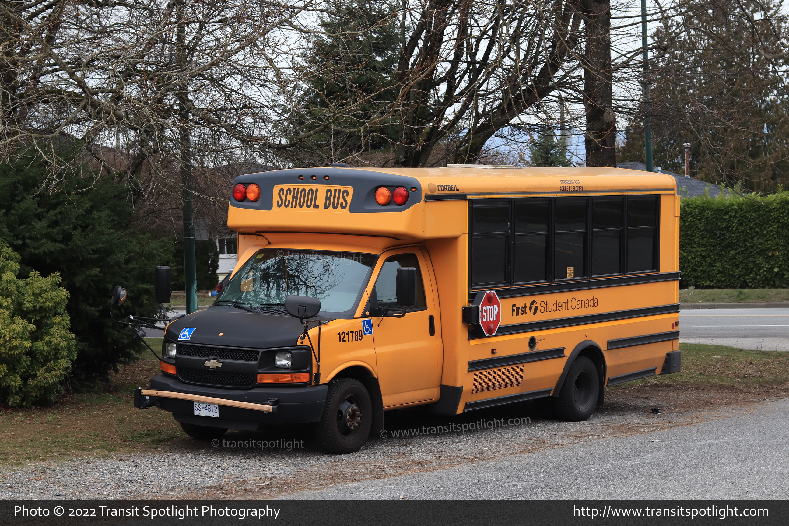121789, a 2012 Corbeil NexBus on a Chevrolet Express chassis is seen on layover on Stirling Street at W 41 Avenue in Vancouver, BC. |