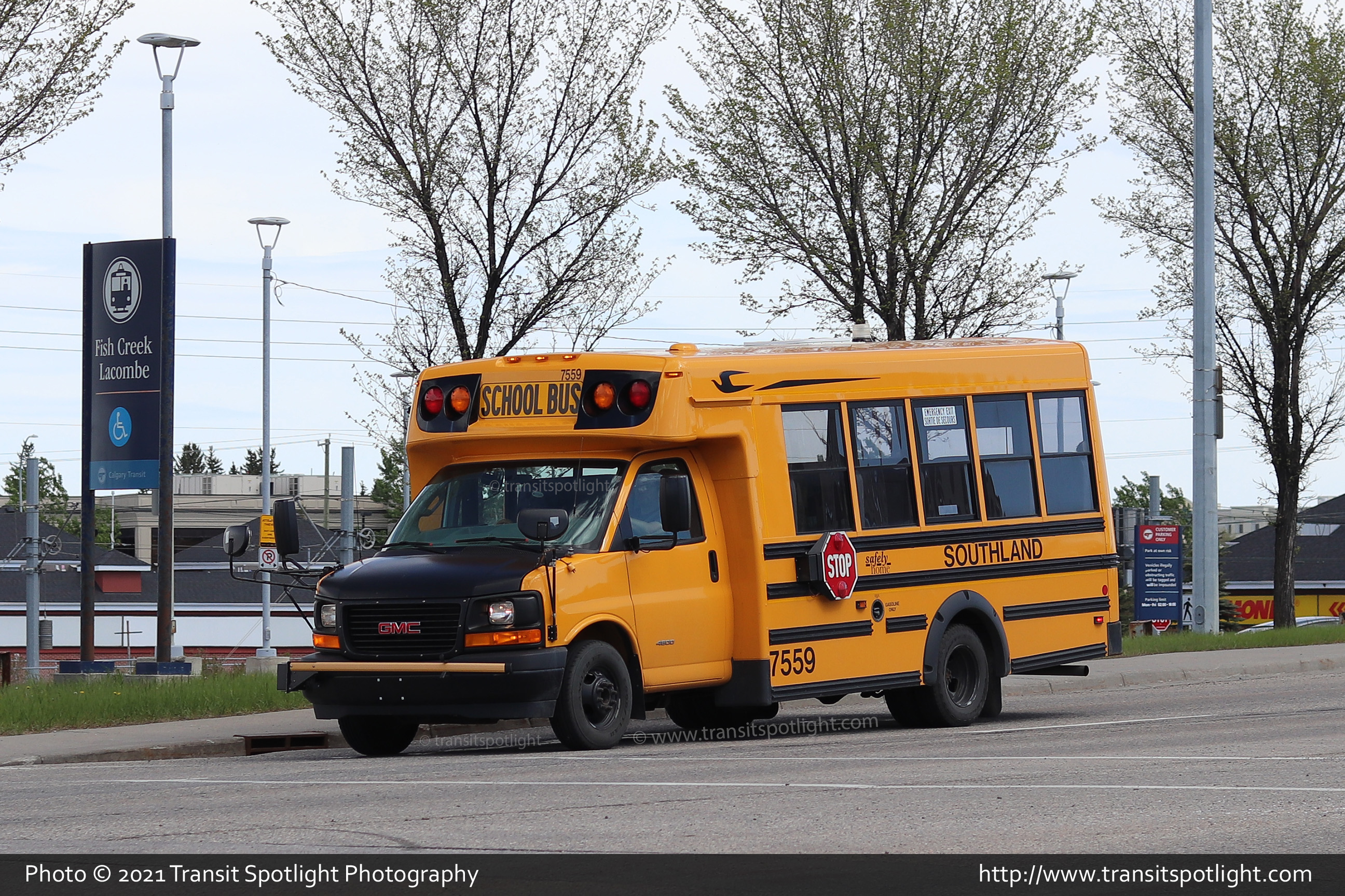 7559 is seen on Shawnee Gate, adjacent to Fish Creek LRT Station while completing its route assignment. |