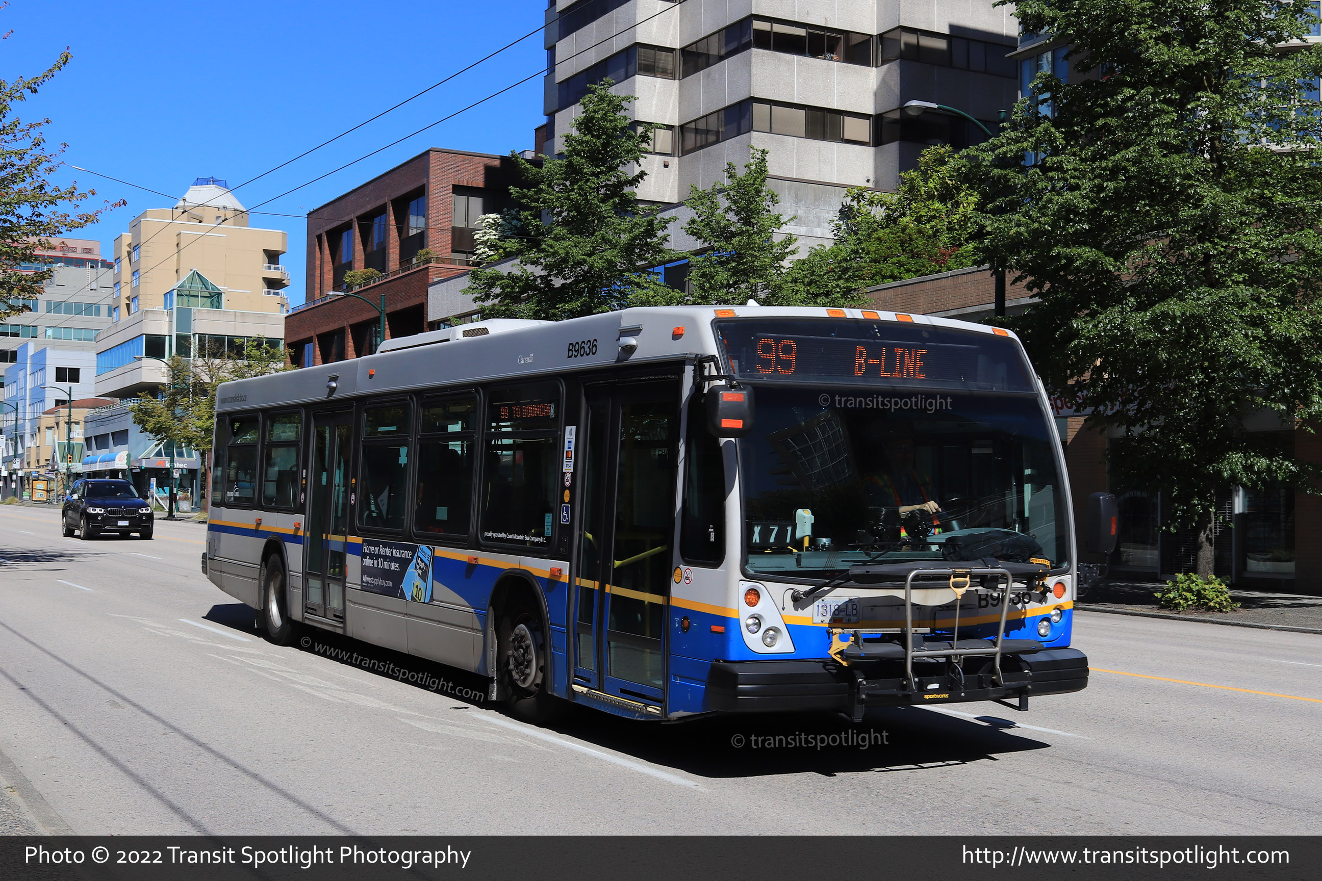 9636 is seen at W Broadway and Spruce St in Vancouver while working Route 99 B-Line to Boundary Loop. |