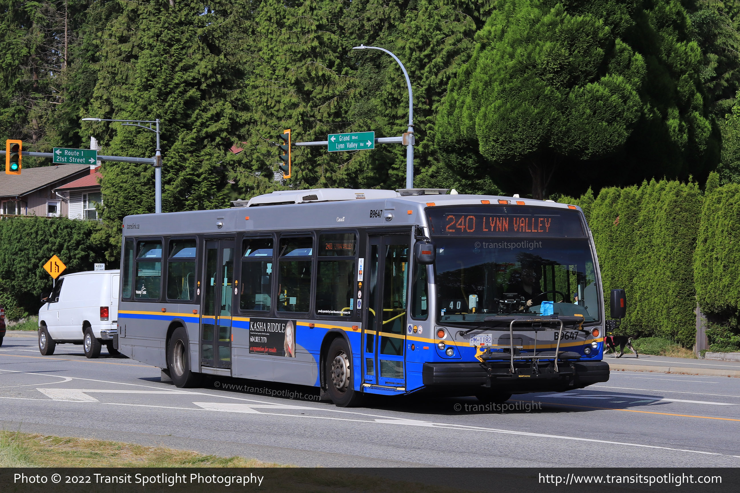 9647 is seen at Lynn Valley Road at Hwy 1 in North Vancouver while working Route 240 Lynn Valley. |