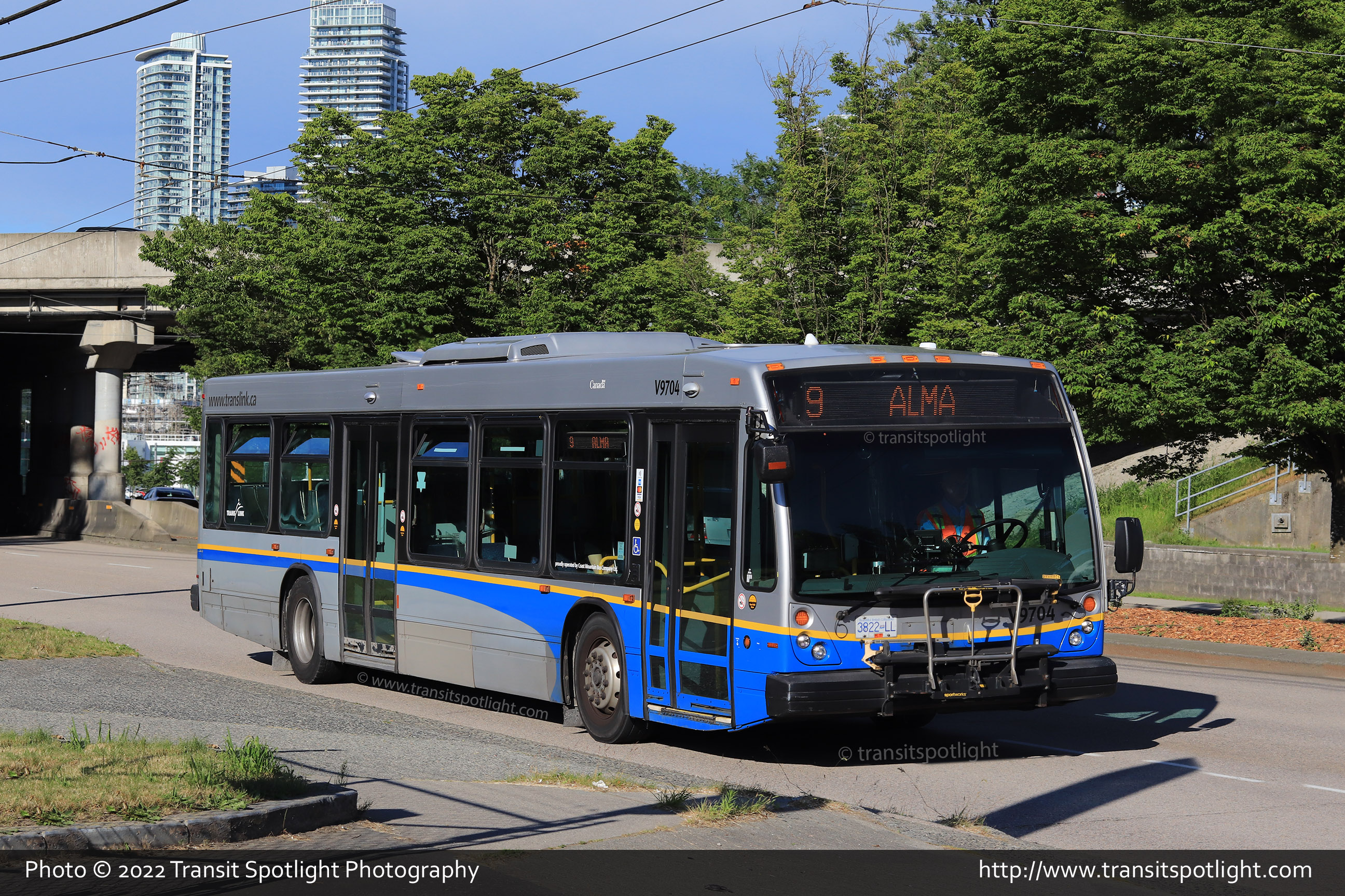 9704 is seen at Lougheed Hwy and east of Skeena Street in Vancouver while working Route 9 Alma. |